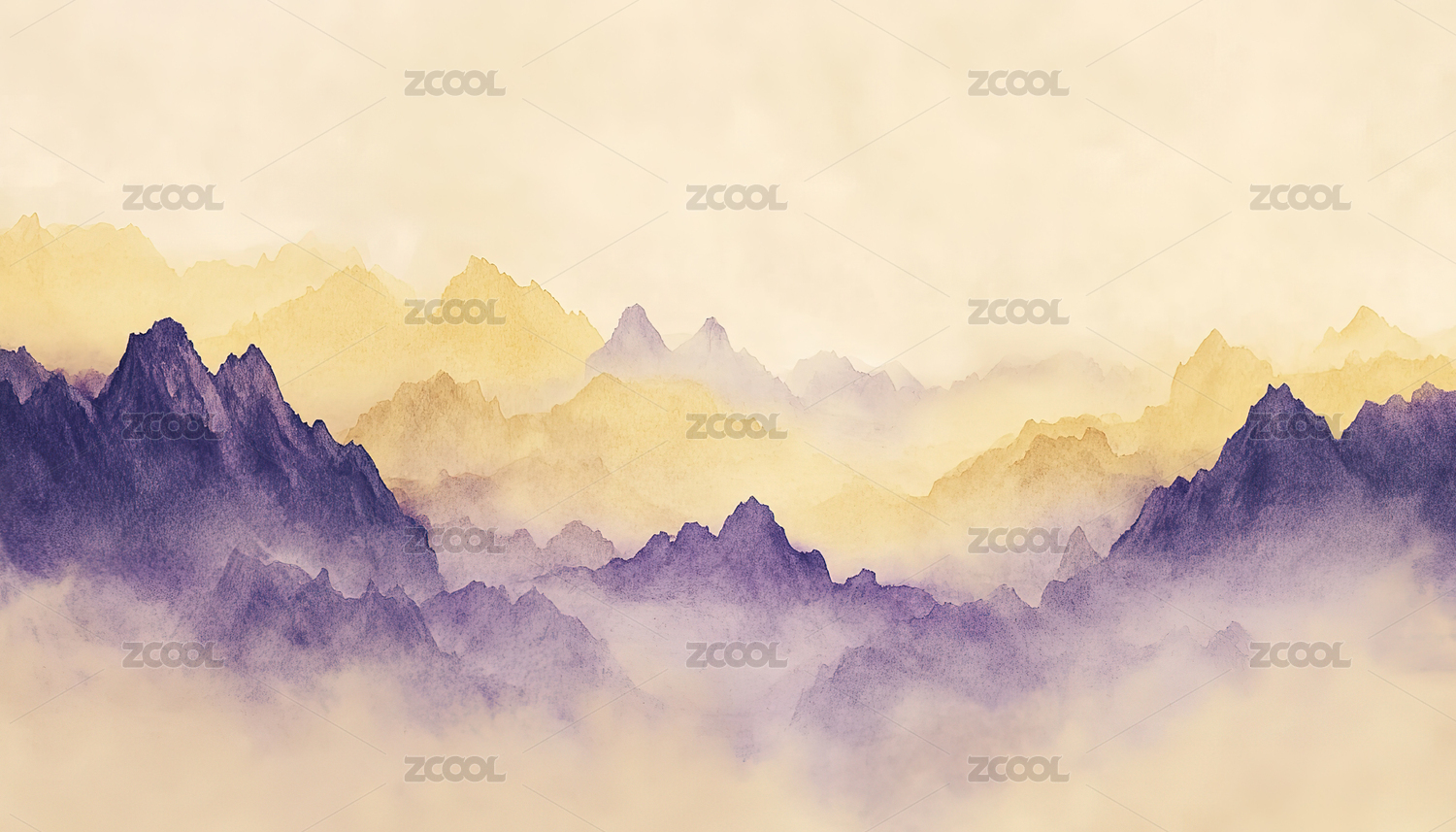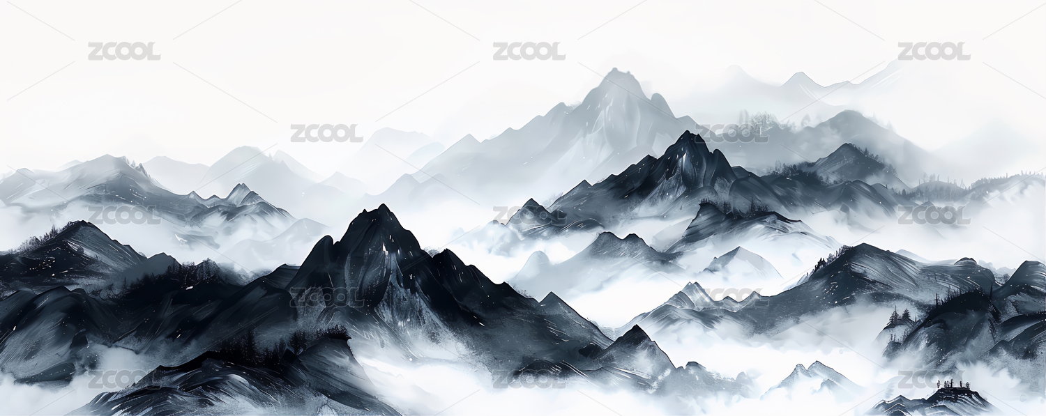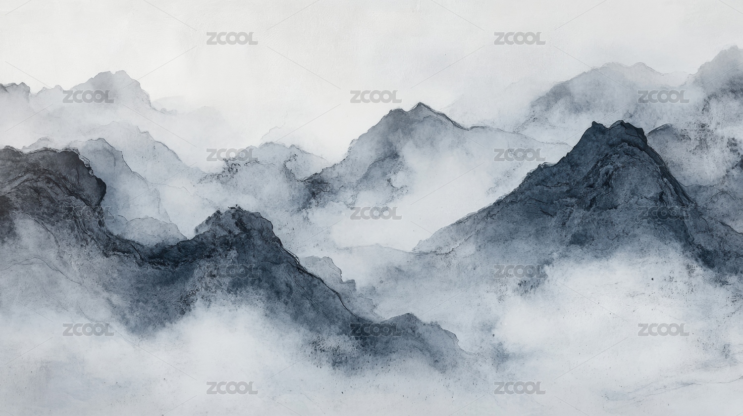 中国水墨画风格的山峰在云雾中若隐若现,展
