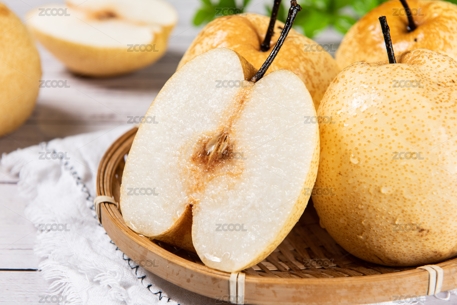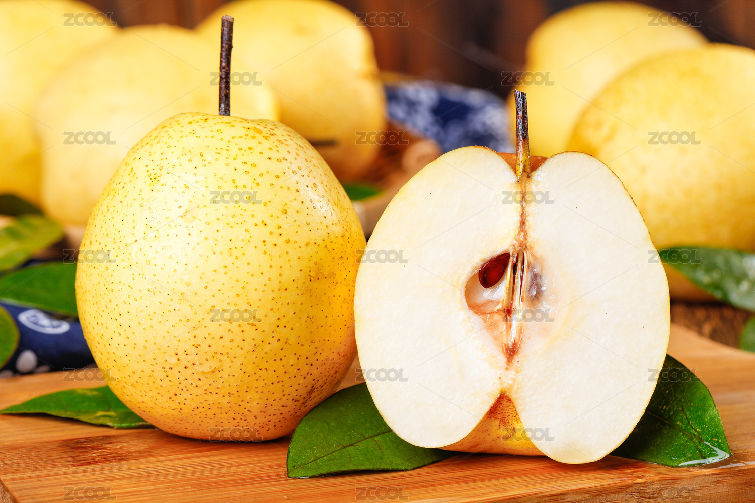 木板上放着一个完整的赵州雪梨和半边脆梨