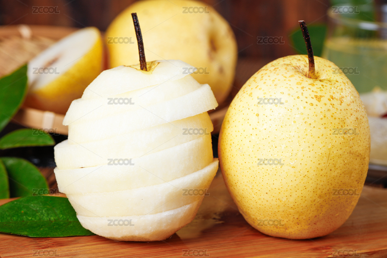 木底上放着一个完整砀山雪梨和一个切块雪梨