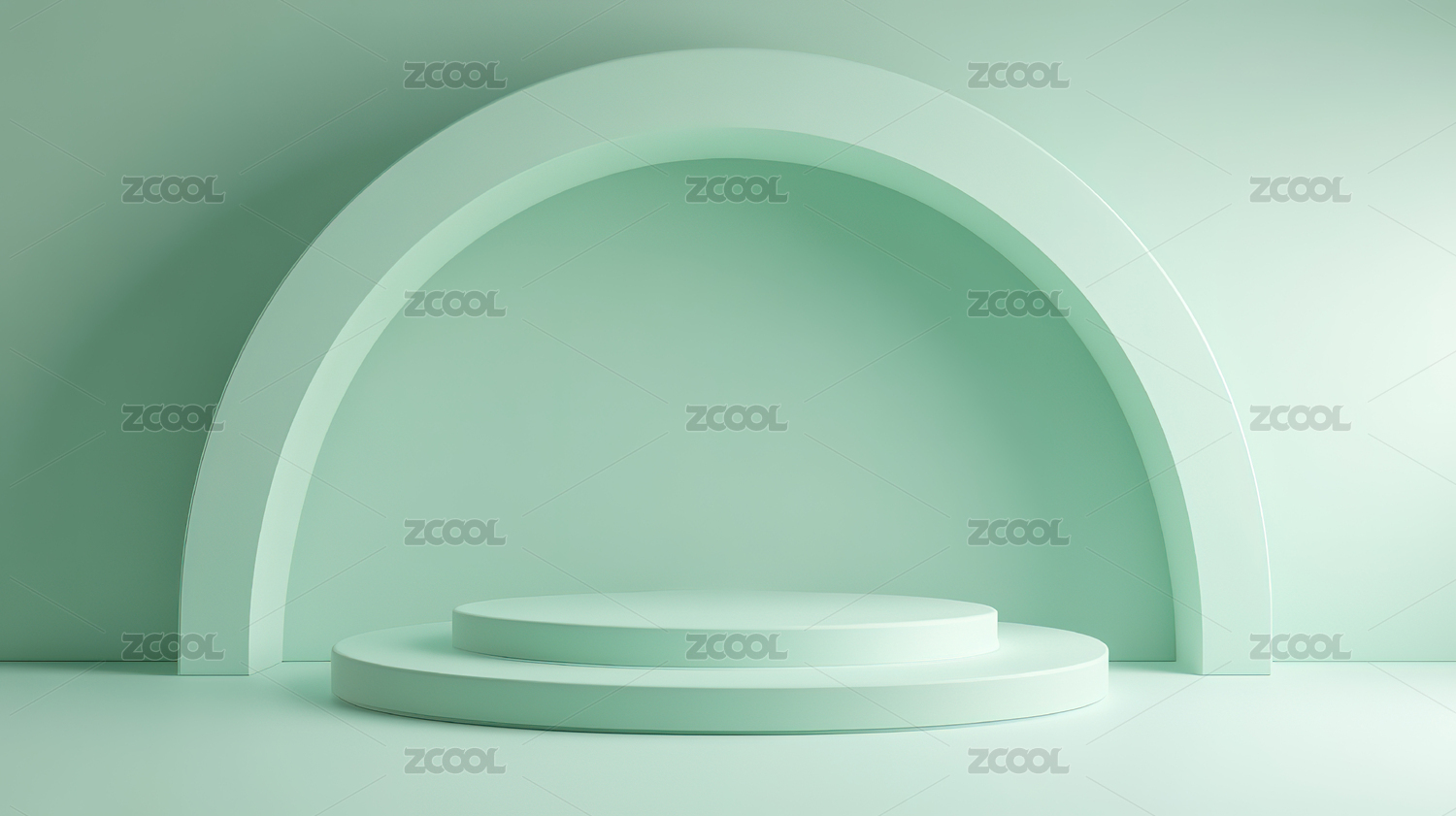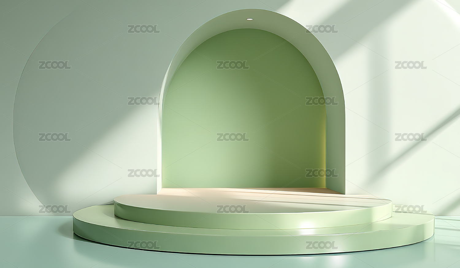 简约绿色背景下的弧形门洞与圆台