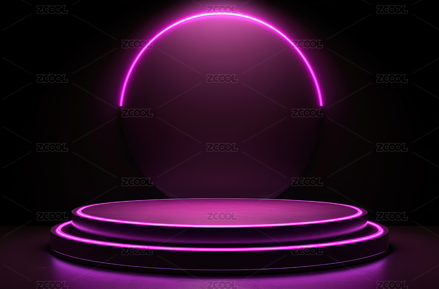 3D渲染霓虹灯带暗色圆形底座产品展台