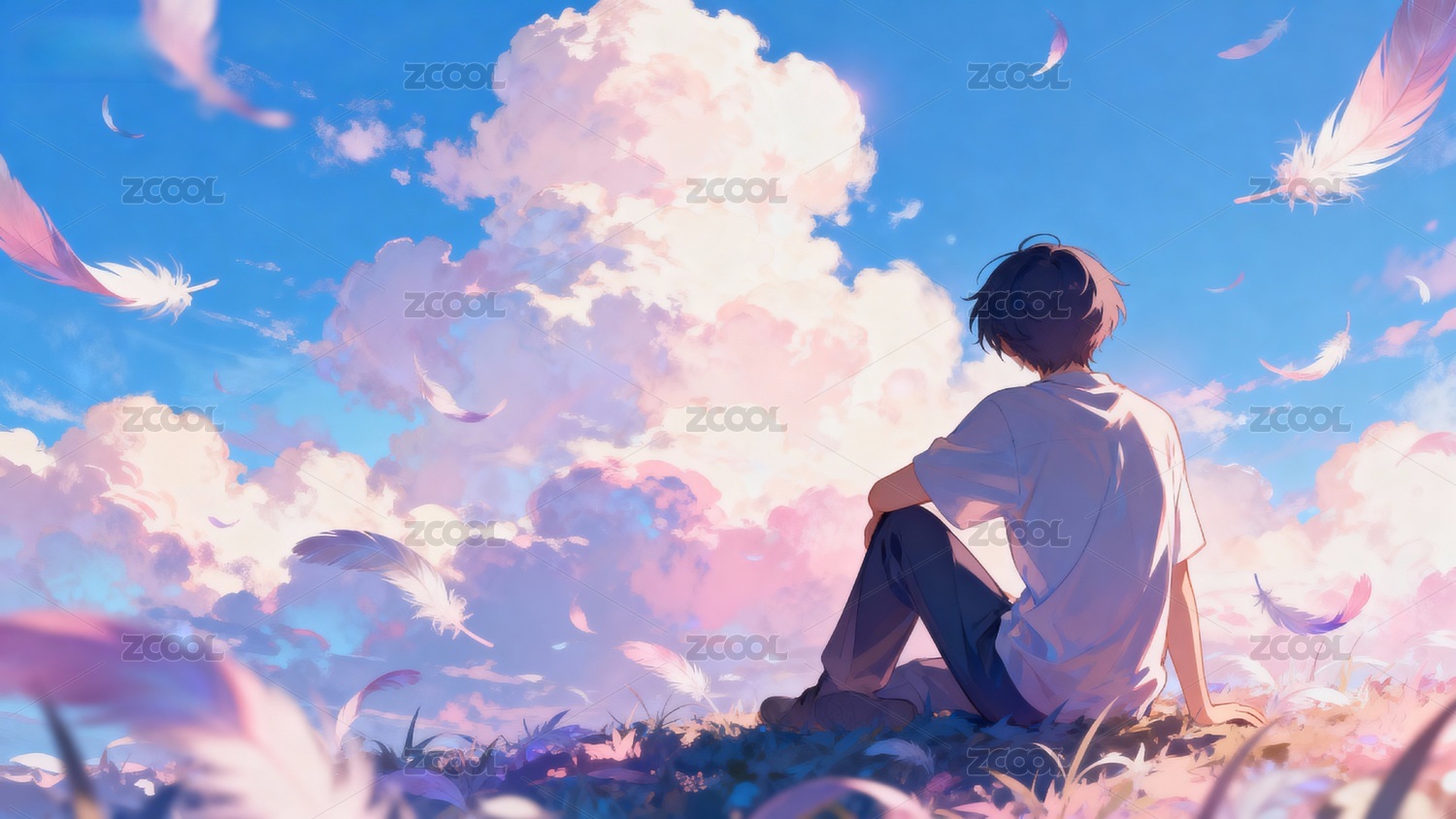 AIGC202402,学生,人物,学习,大学生,草地,晒太阳,蓝天,悠闲,假期