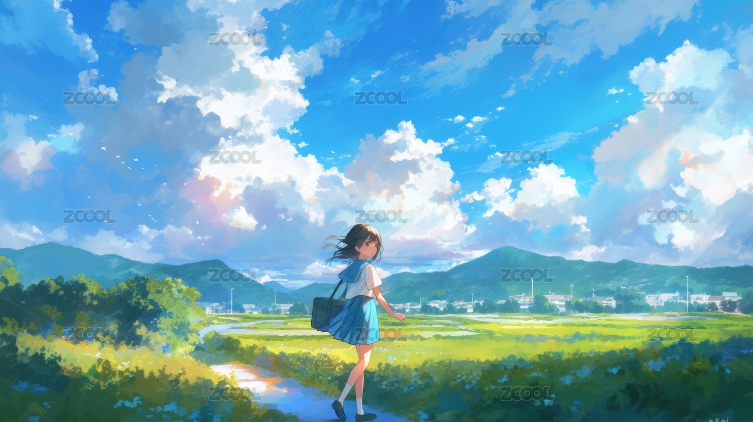 奔跑在草原的卡通女孩唯美清新治愈系插画