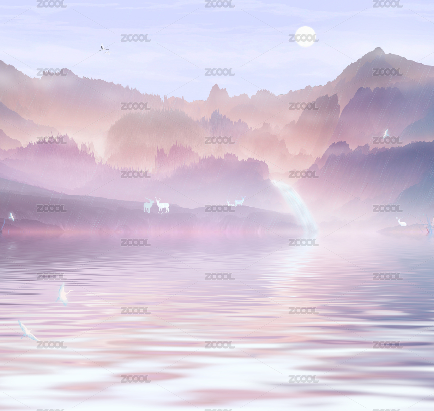 早晨森林云雾朦胧,鹿在山脚下吃草中国风山水插画背景