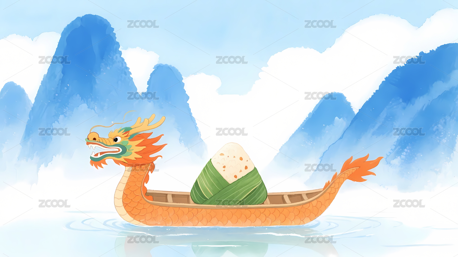 国潮传统端午节粽子击鼓龙舟远山和海浪