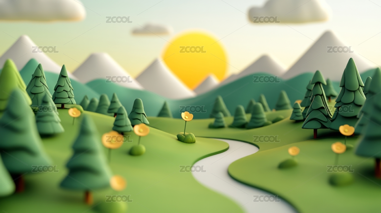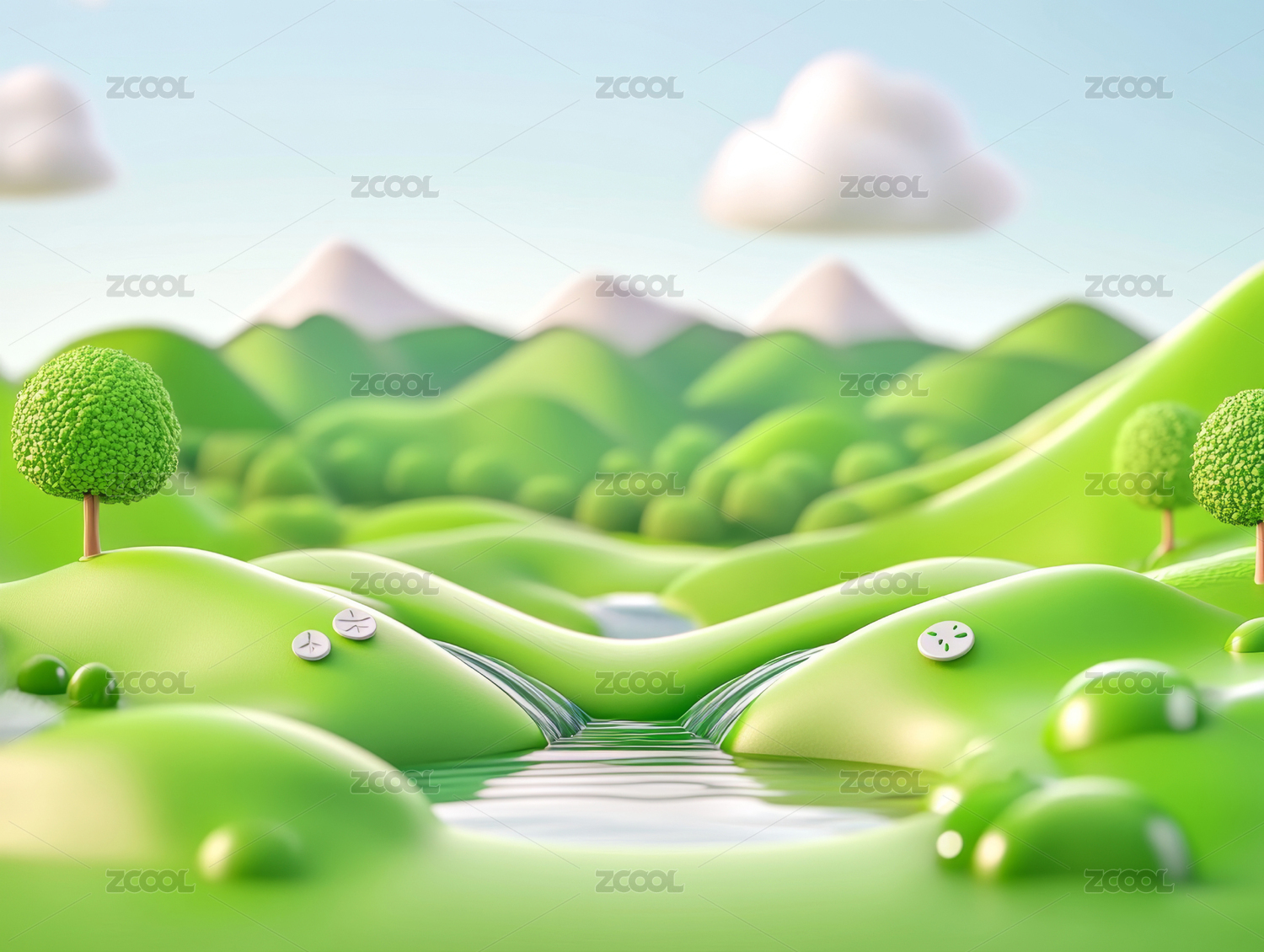 航拍视角蜿蜒的河流绿色的山脉3D插画