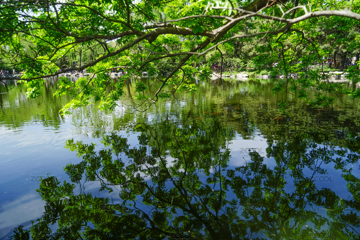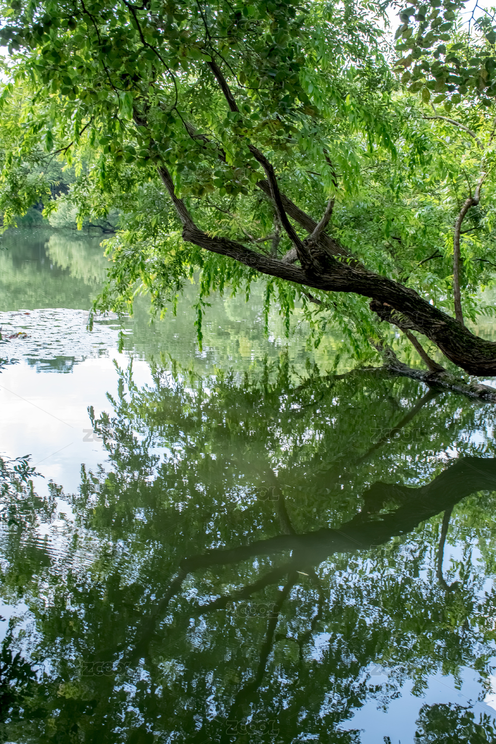 夏天公园绿树湖面倒影