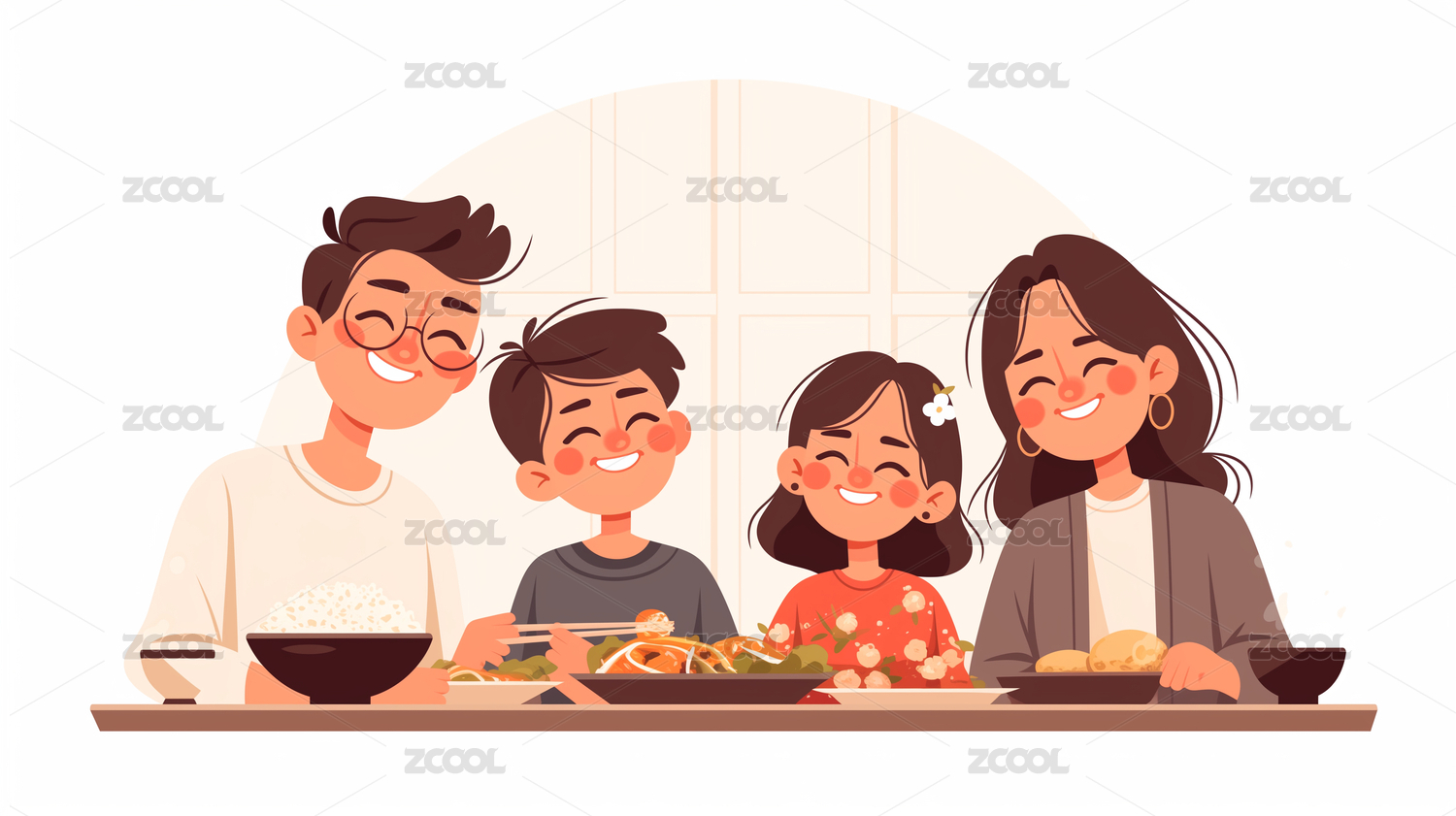 卡通新年春节年夜饭团圆饭吃饭家人团圆背景矢量插画
