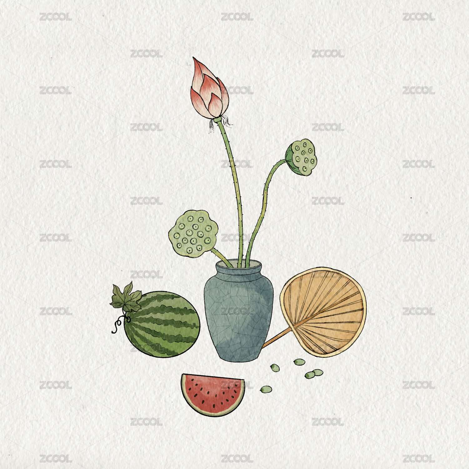 夏日荷花莲蓬莲子西瓜蒲扇水墨画