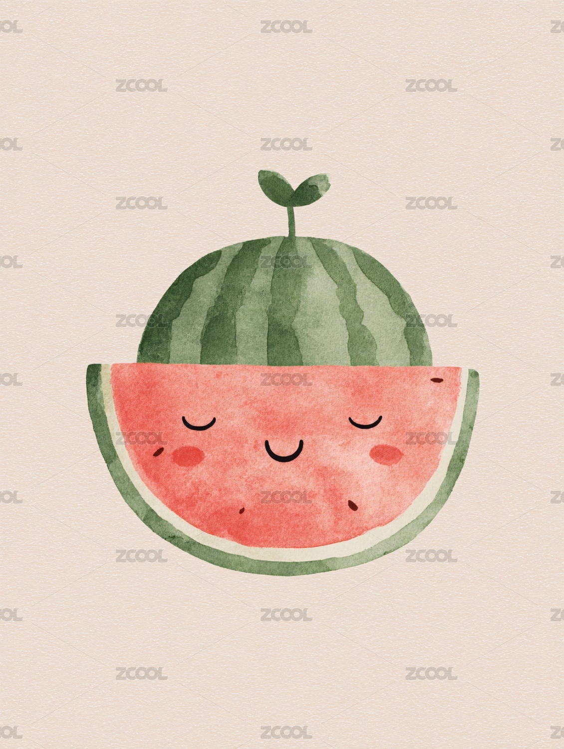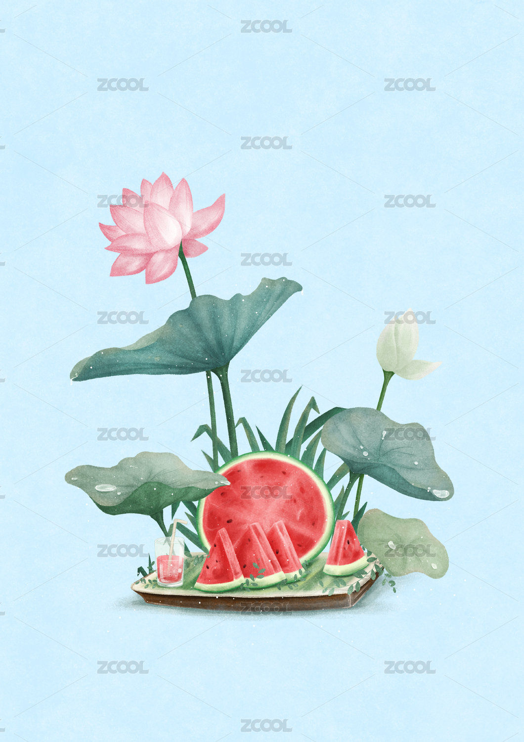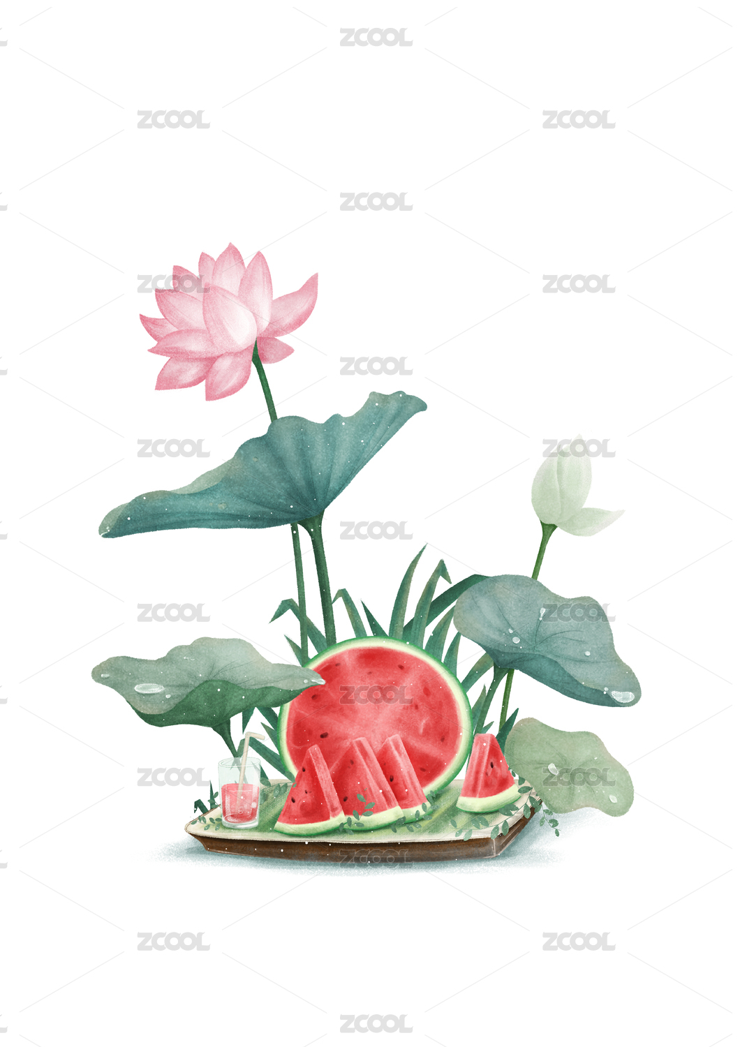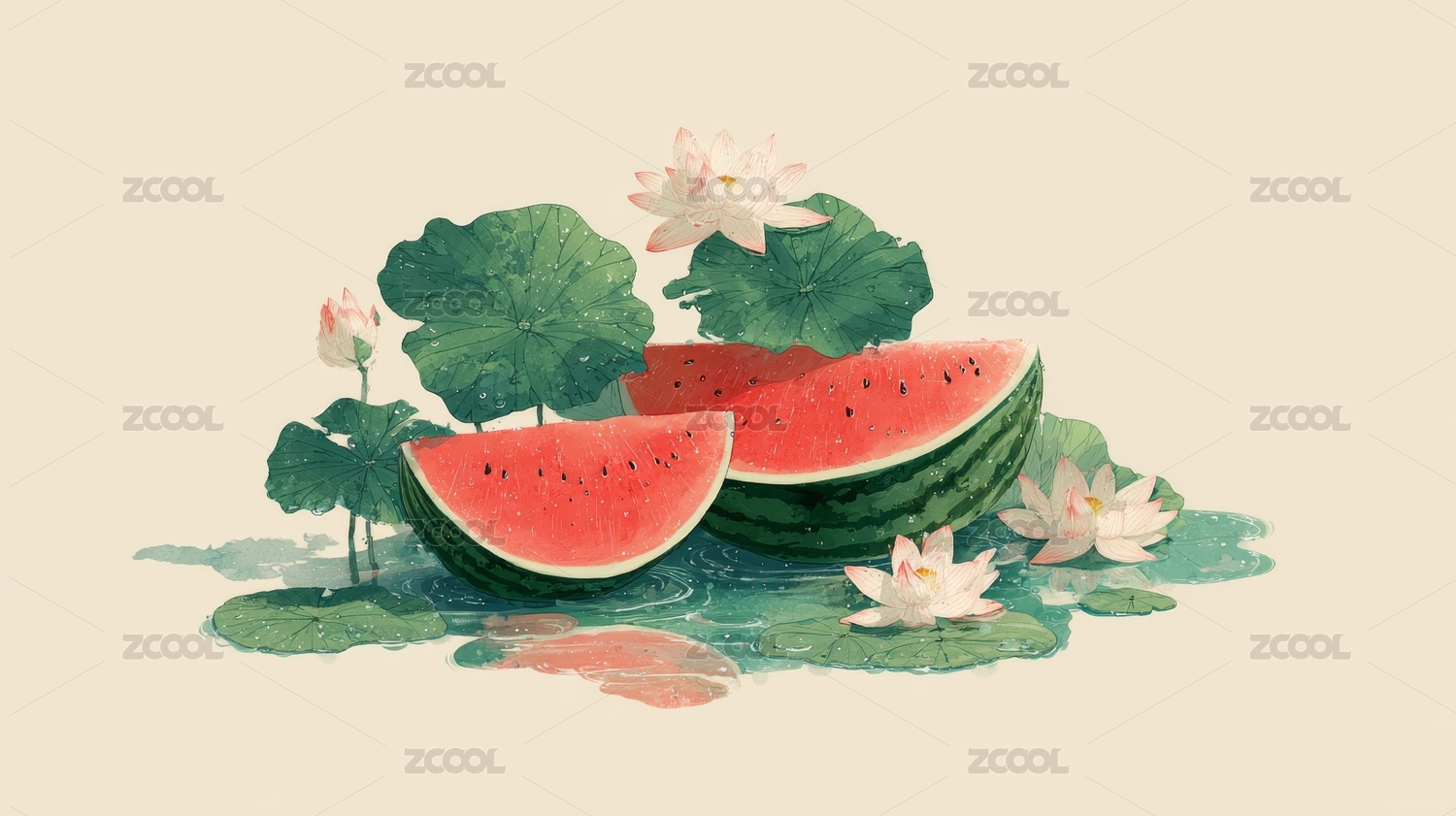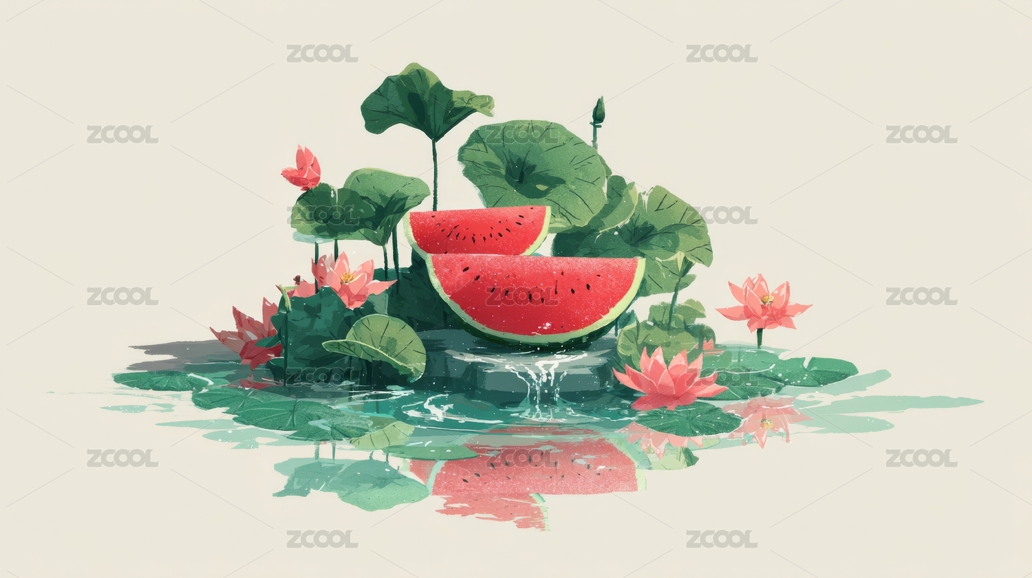 河面上荷叶切开的西瓜柳叶夏至节气插画