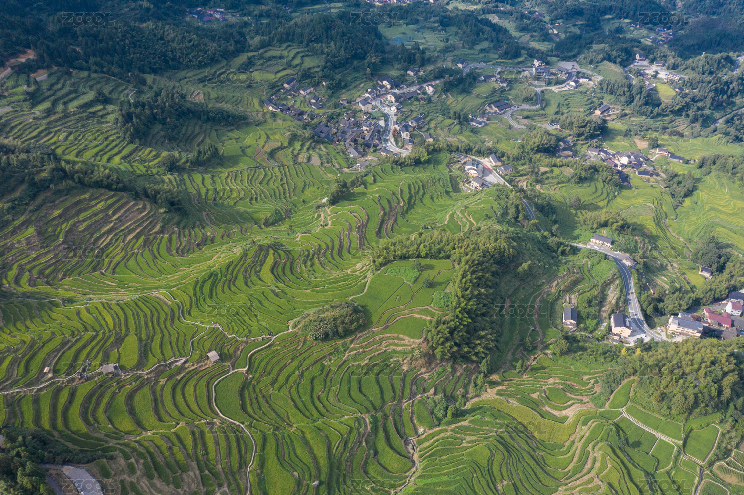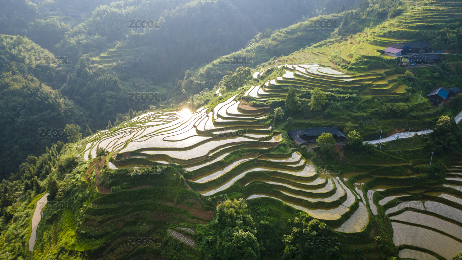 中国湖南小横垅金子山春耕时节的梯田航拍图