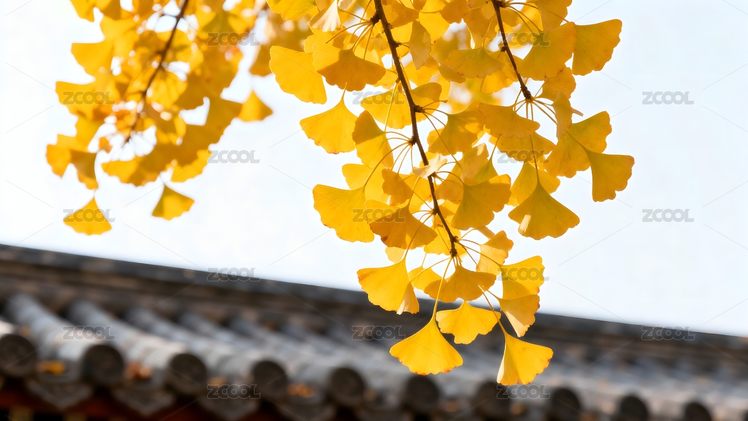 秋日蓝天下的金色银杏树叶与中国传统屋顶