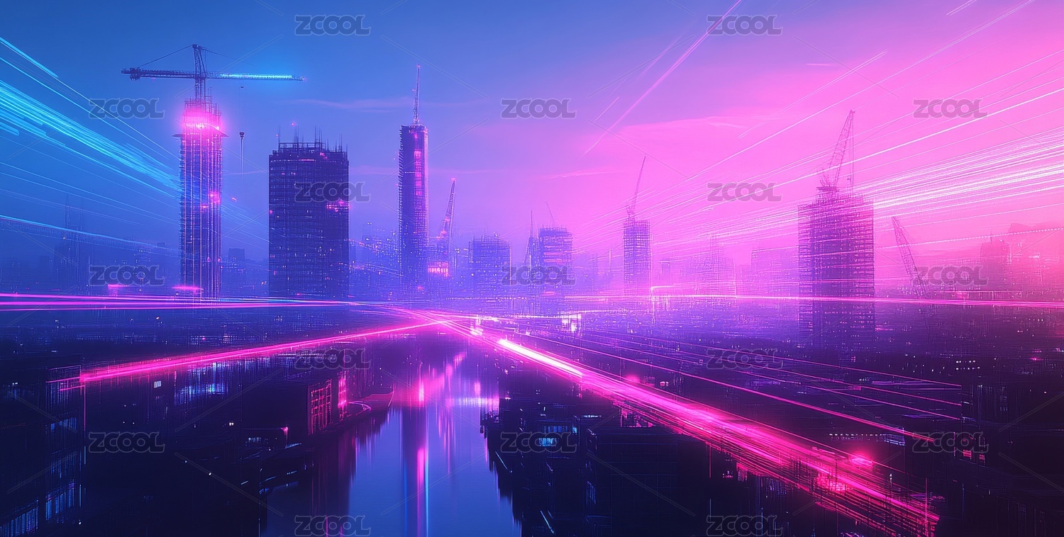 蓝色,科技感,城市,插画,地平线,行车道,放射状,发光,线条,高楼