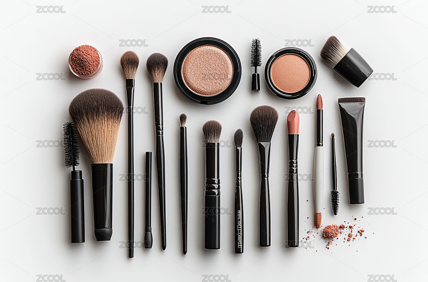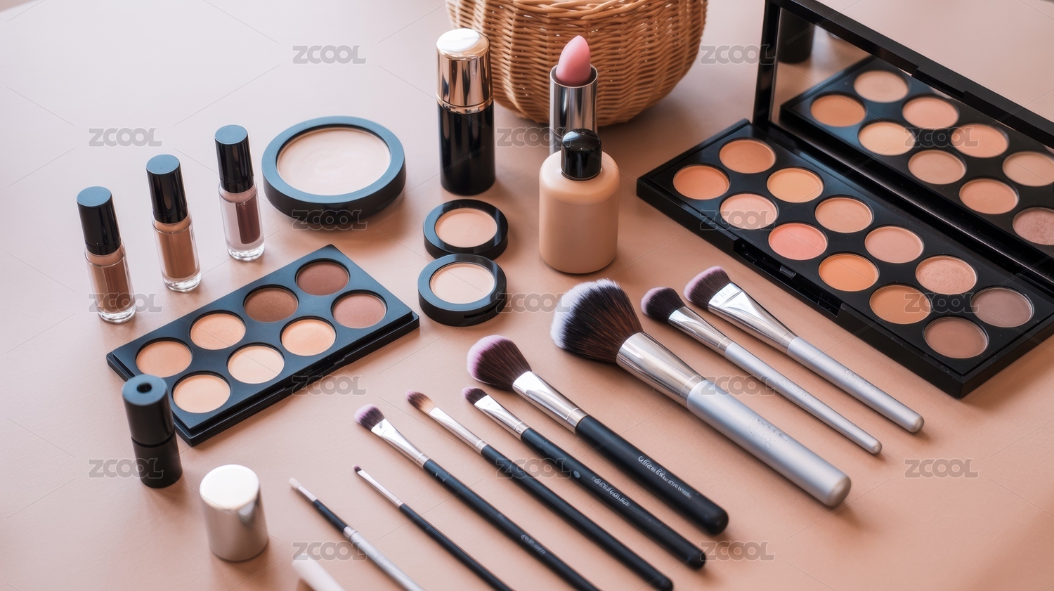 化妆品与化妆刷排列展示