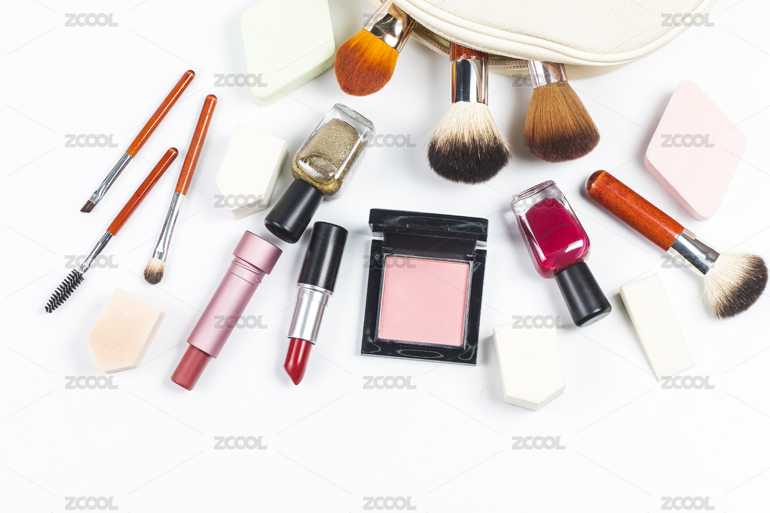 摆放在白色背景上的化妆品和化妆道具