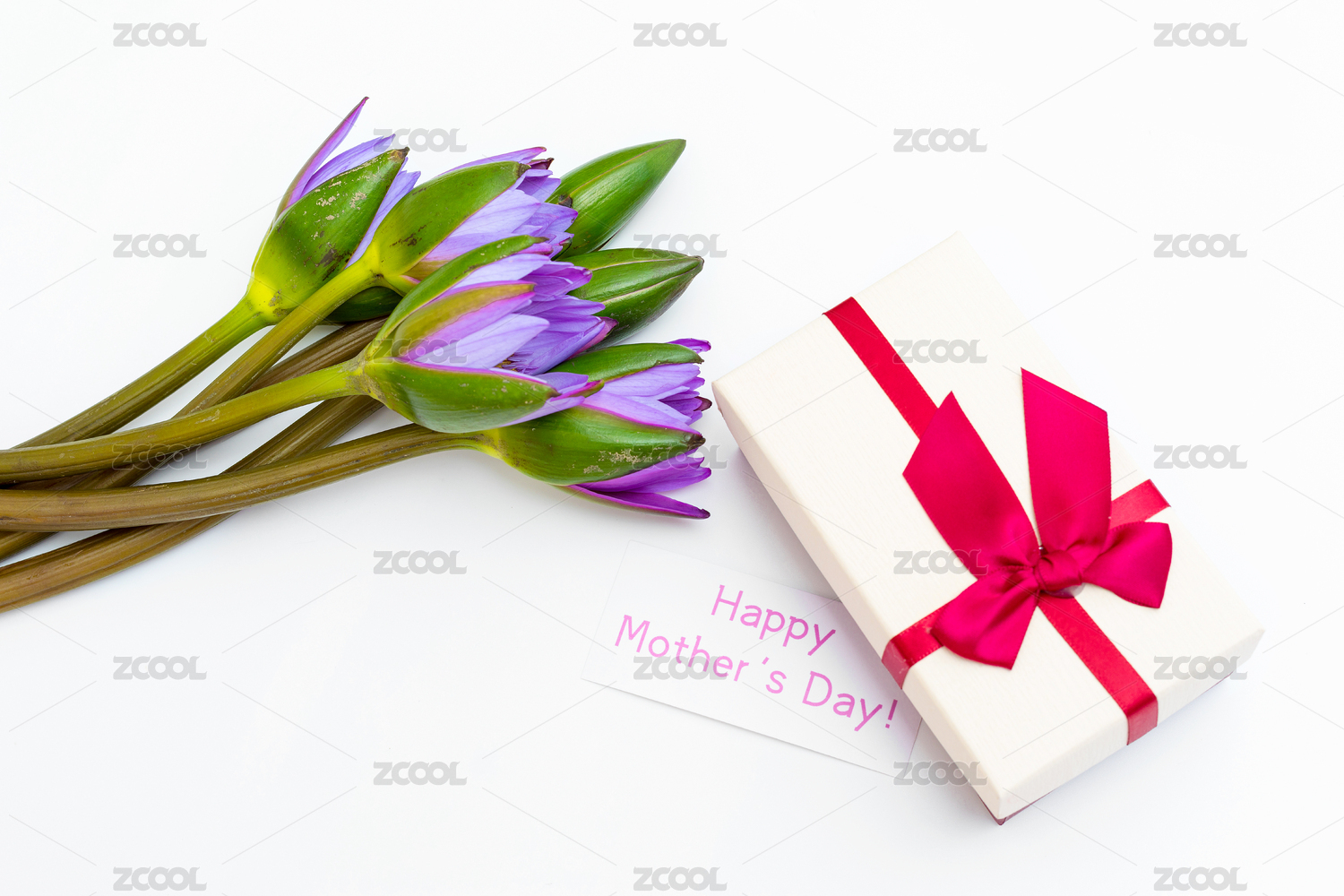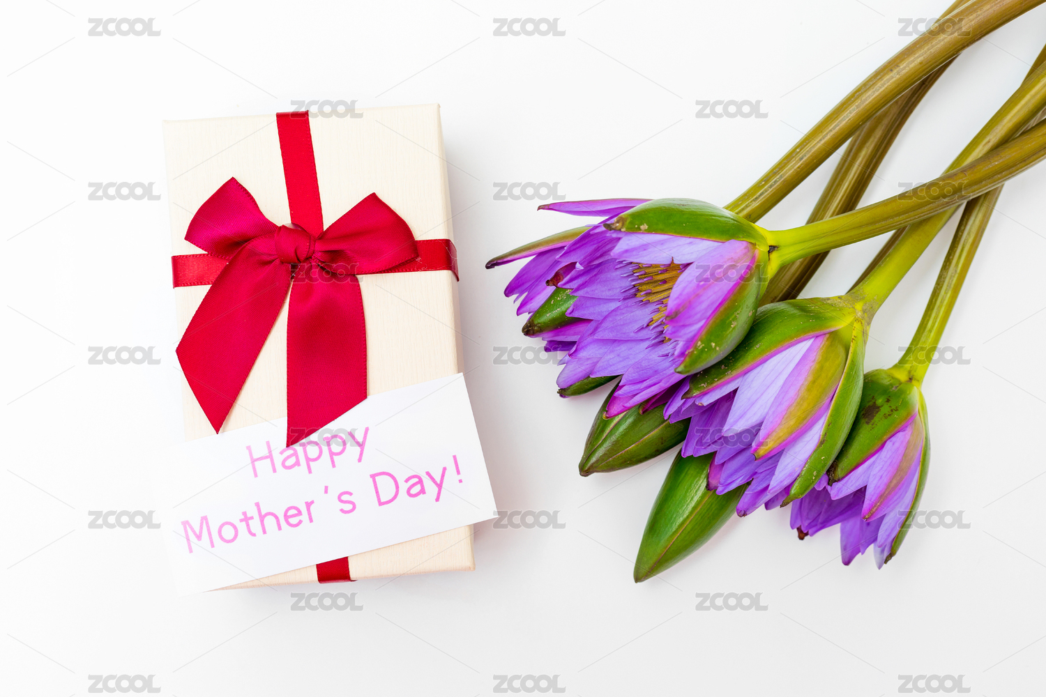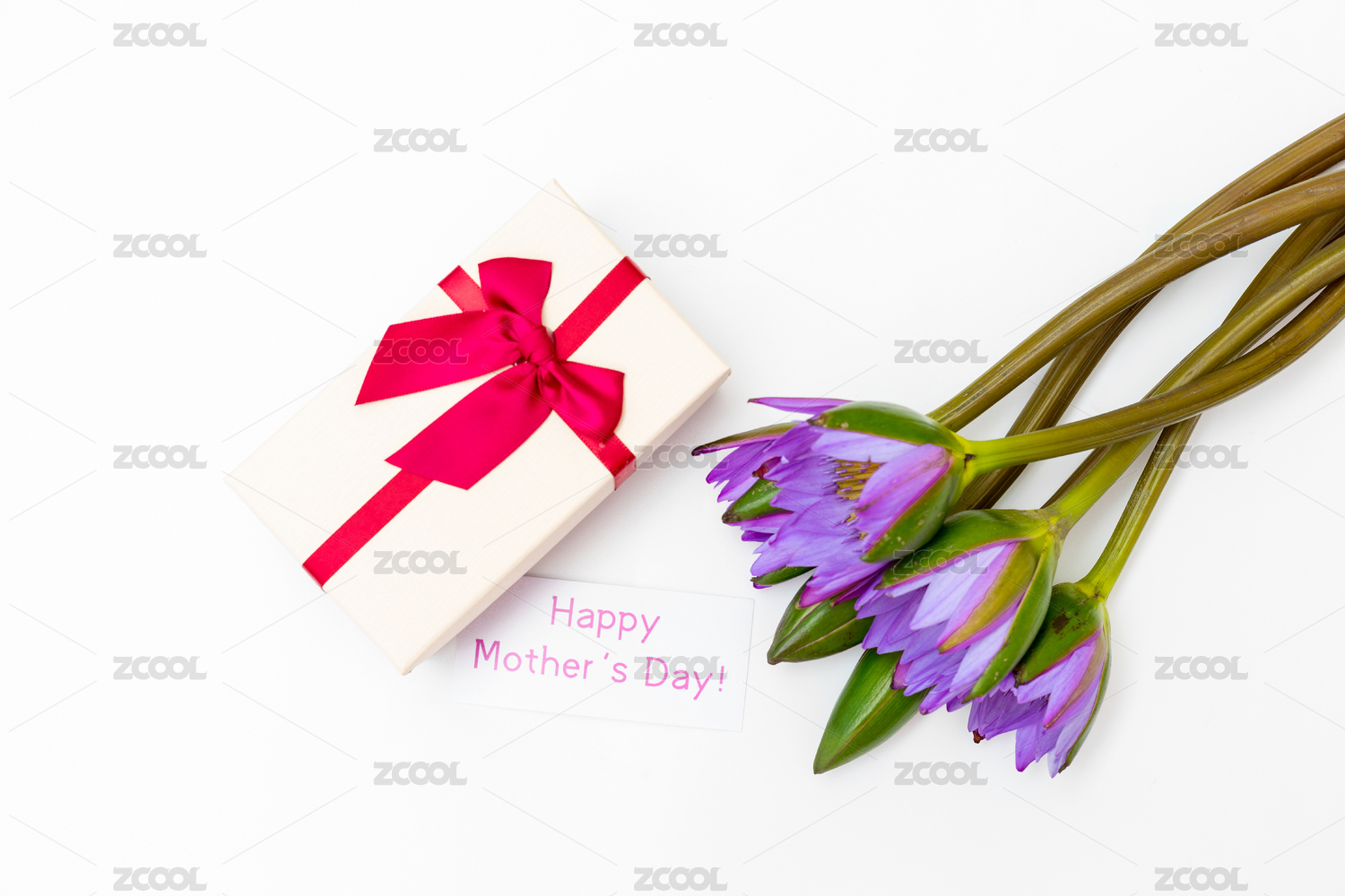 白色背景上的睡莲、礼物盒和母亲节贺卡