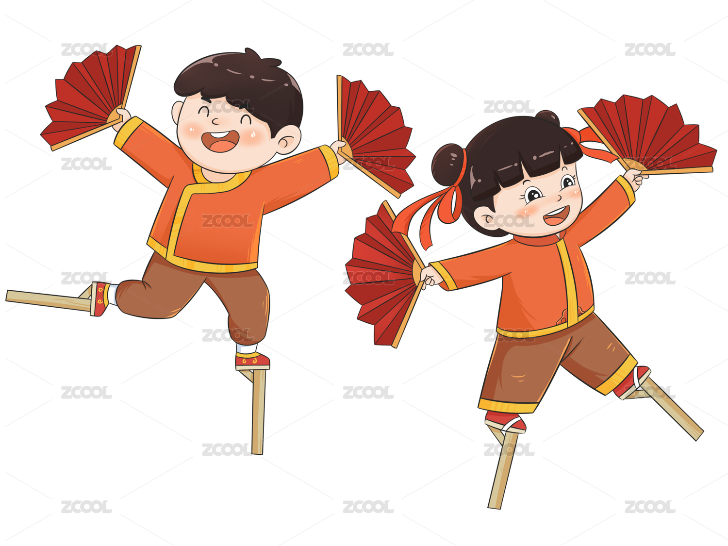 踩着高跷跳秧歌男女手拿扇子福娃节日春节