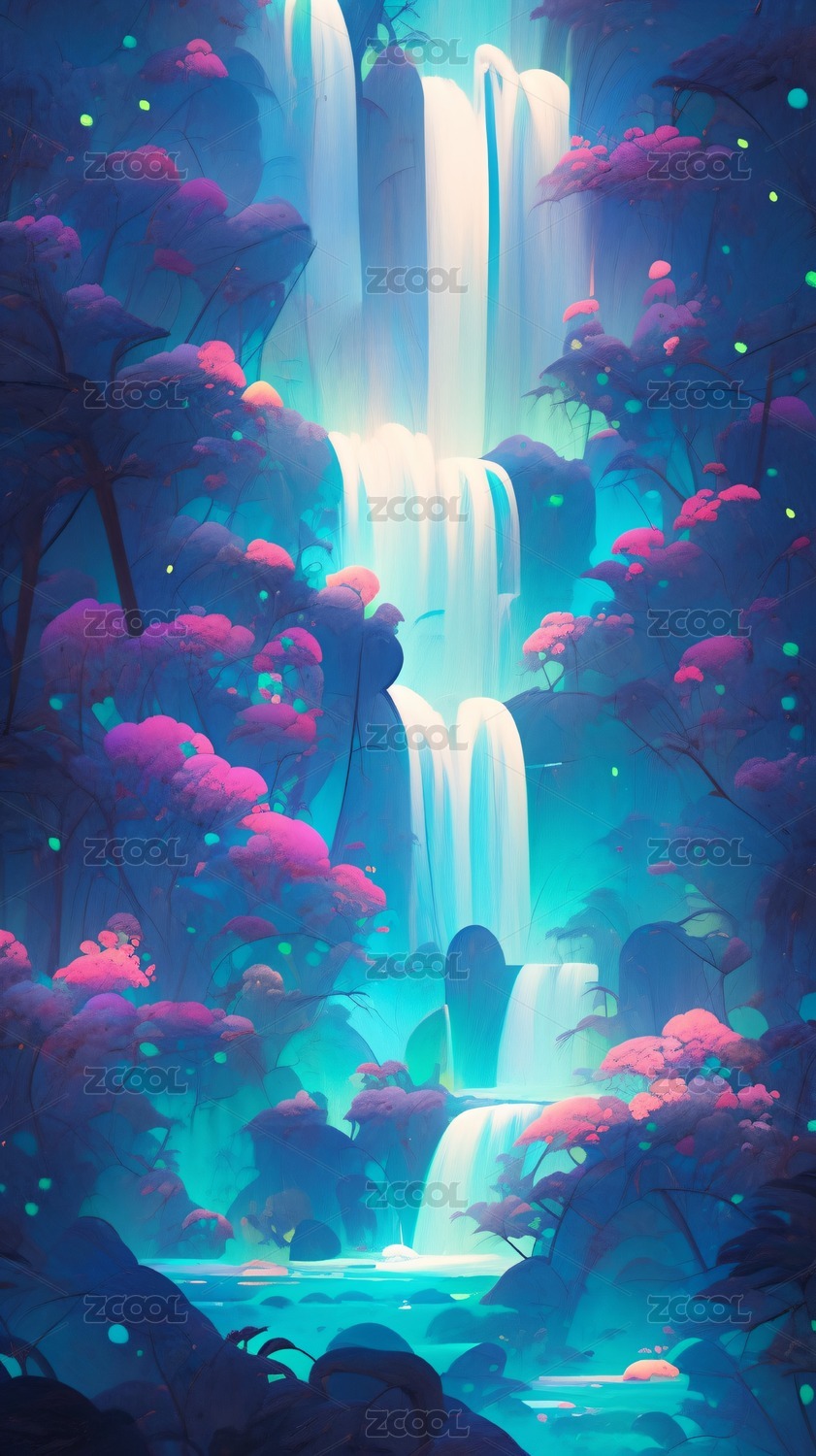 瀑布,森林,彩色,绚彩,湖,小溪,跌水,红树,粉红树,草地