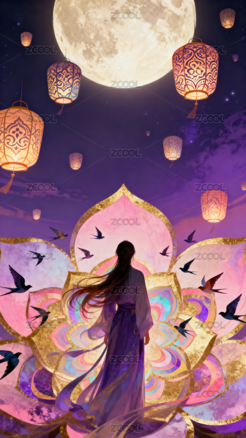 月下飞鸟莲花仙子梦幻夜景