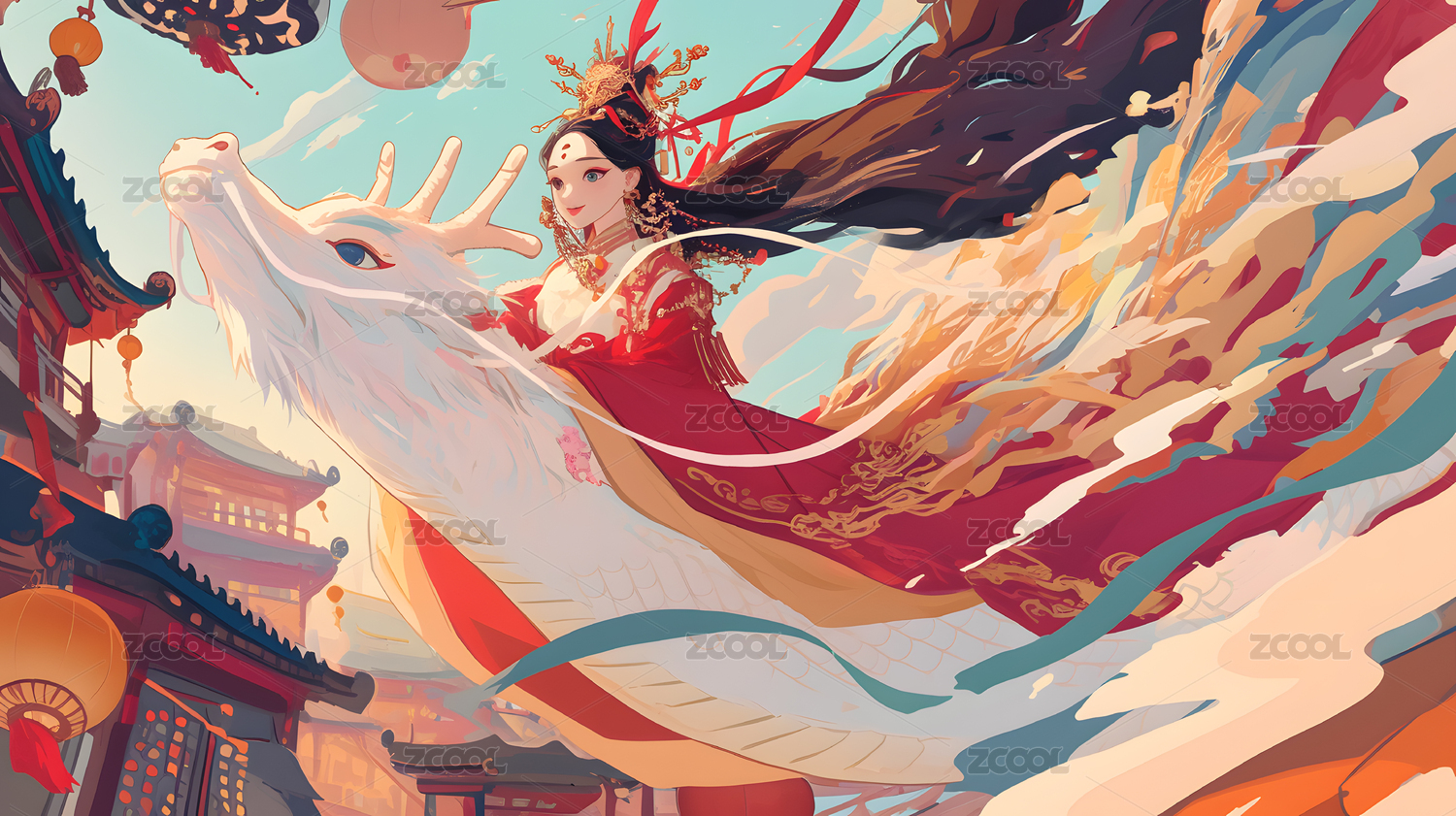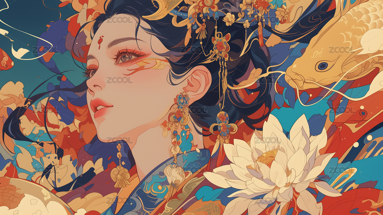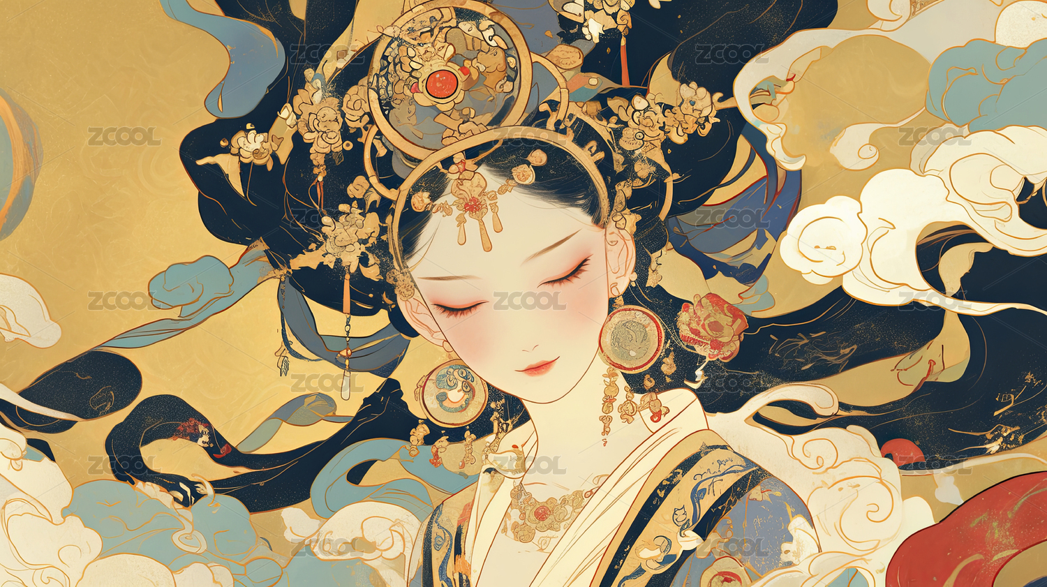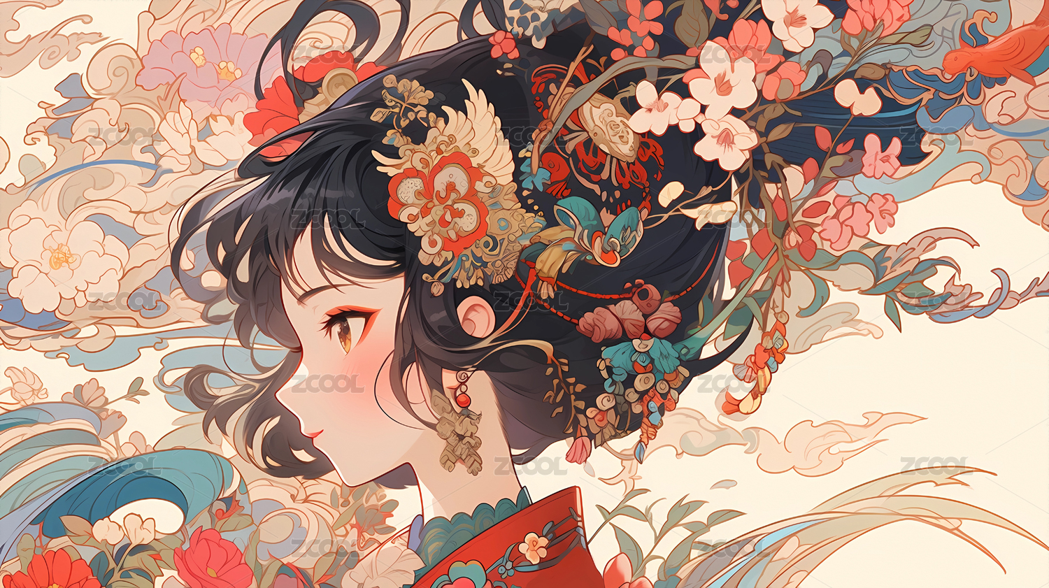 国潮,国风,古装,汉服,女孩,人物,头像,插画,头饰,色彩