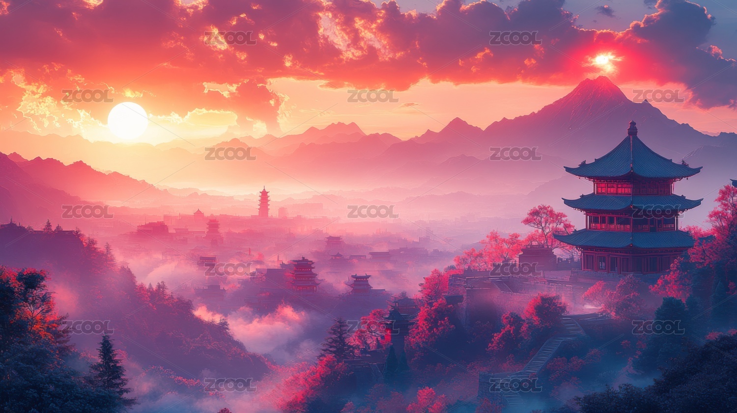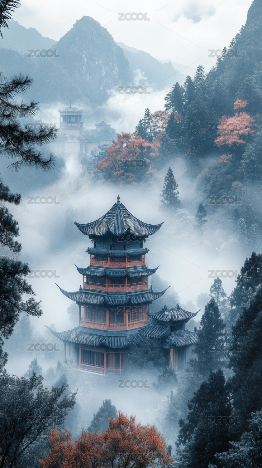 国潮,国风,江山,风景,水墨画,山峰,山脉,山川,树木,天空