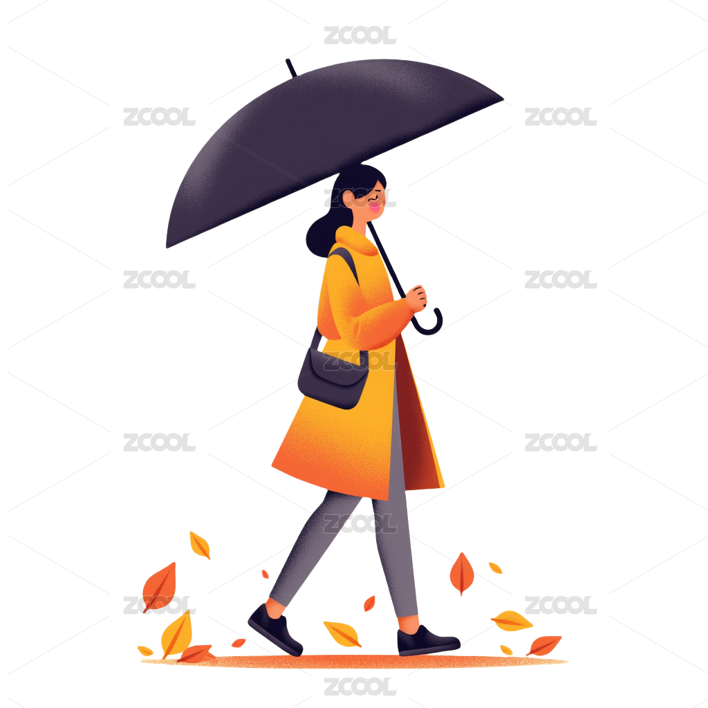 秋季在风中撑伞赶路的女孩金秋扁平风插画