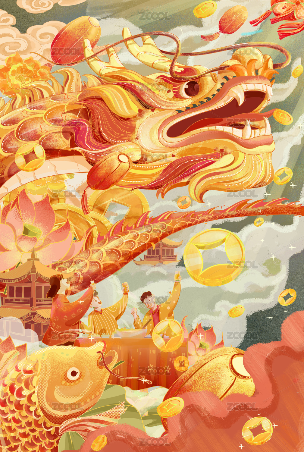 中国风传统节日鲤鱼跃龙门努力克服困难插画