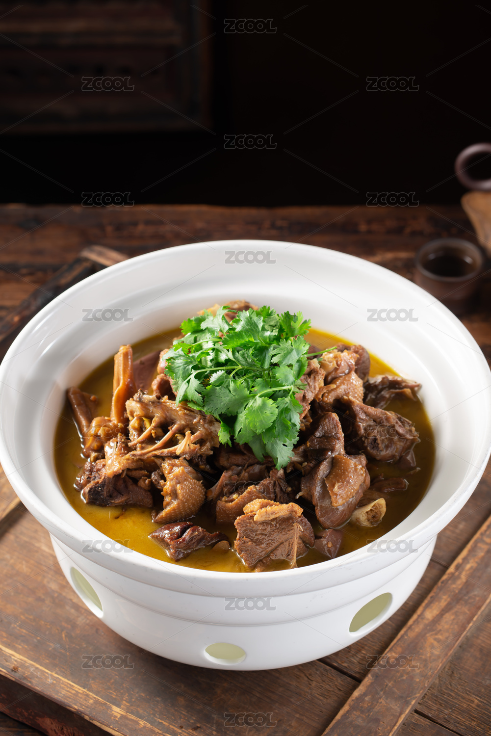 蓝色餐布上有一碗砂锅番茄汁牛杂汤锅