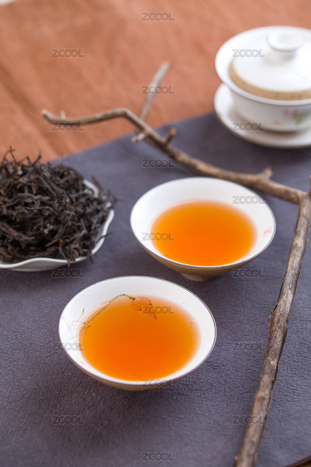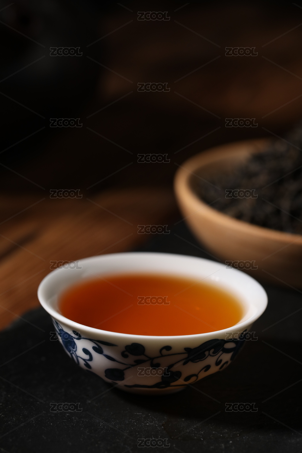 中国风背景木纹桌面上的红茶茶叶和茶水