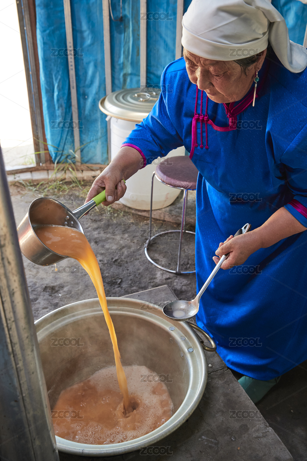 在蒙古包内用传统工艺熬煮蒙族奶茶的过程