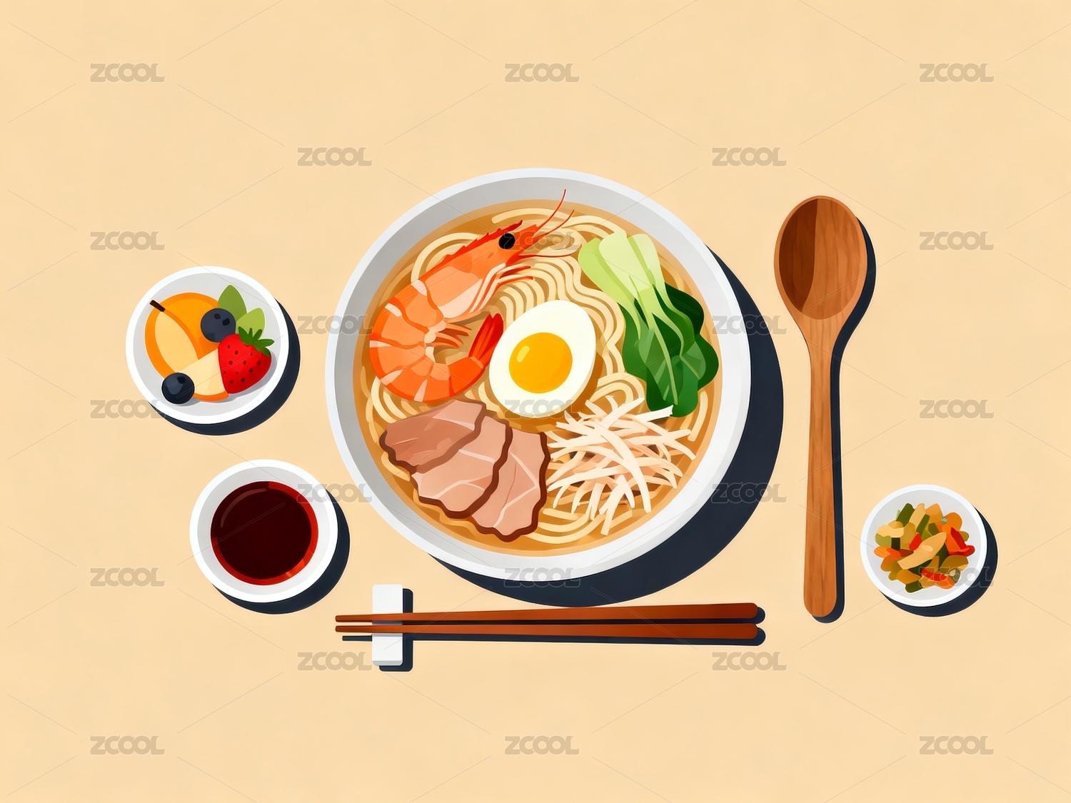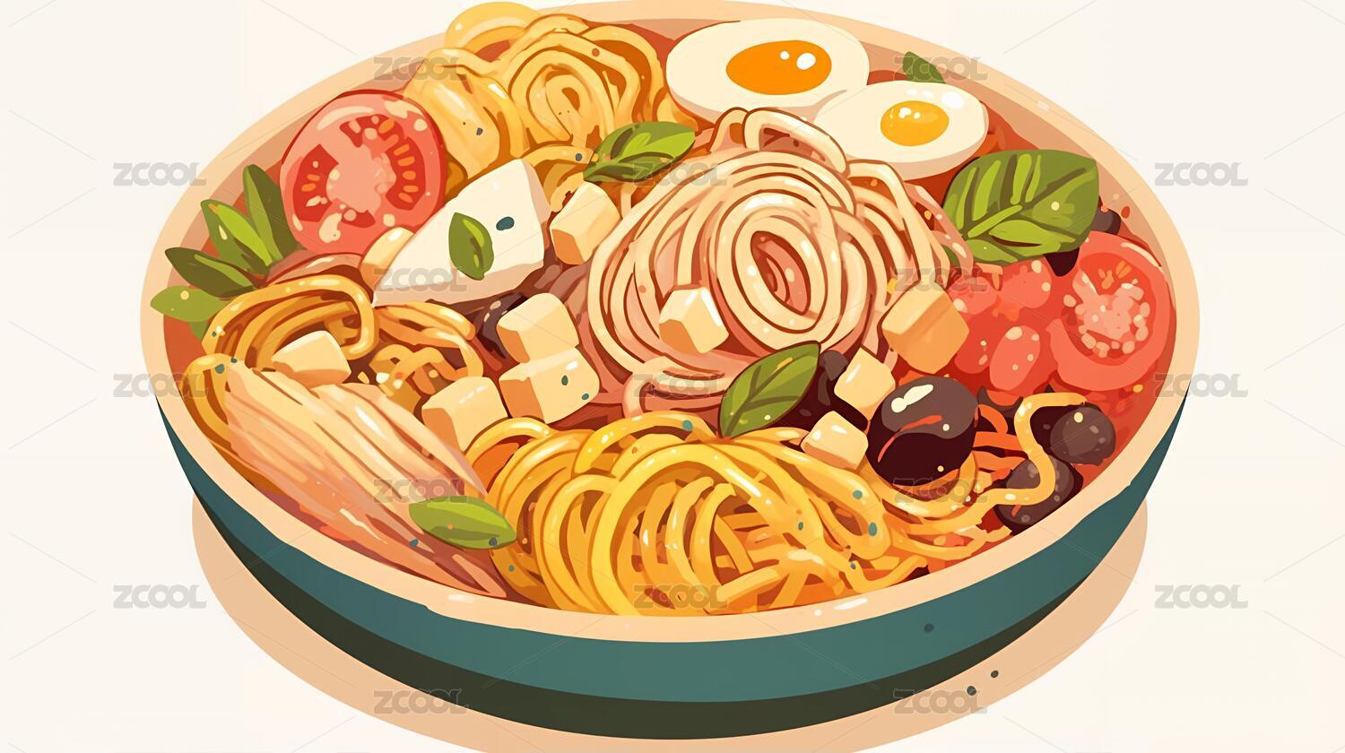 中式快餐大碗牛肉鸡蛋面3D卡通食品插画