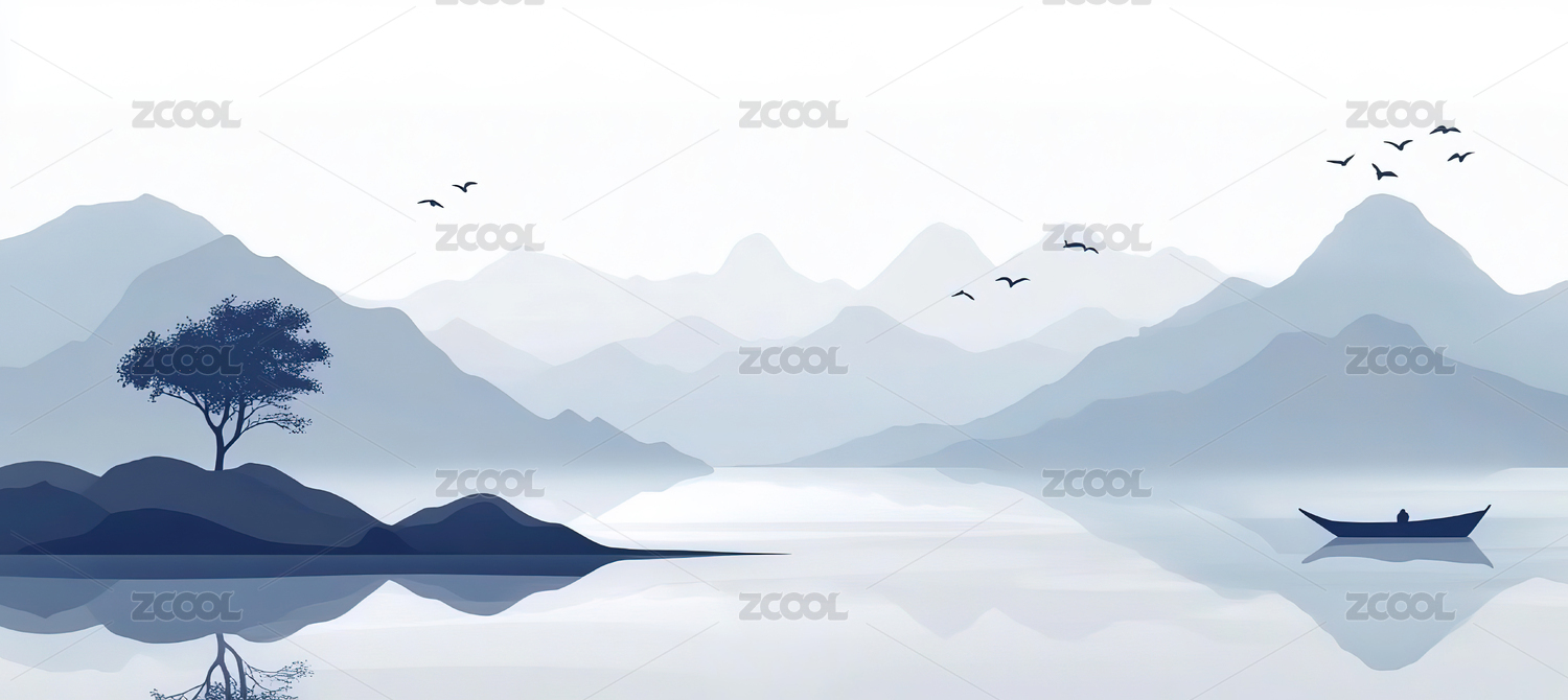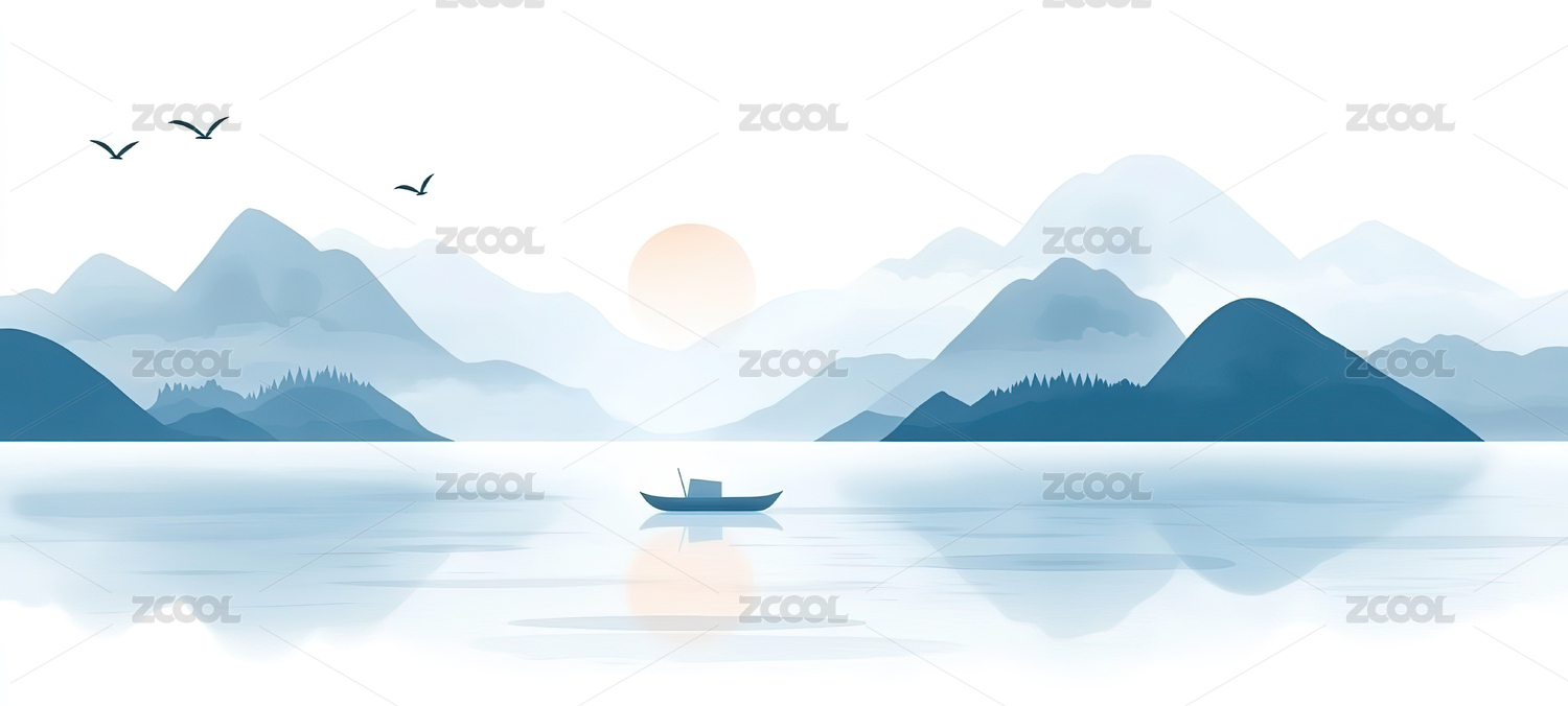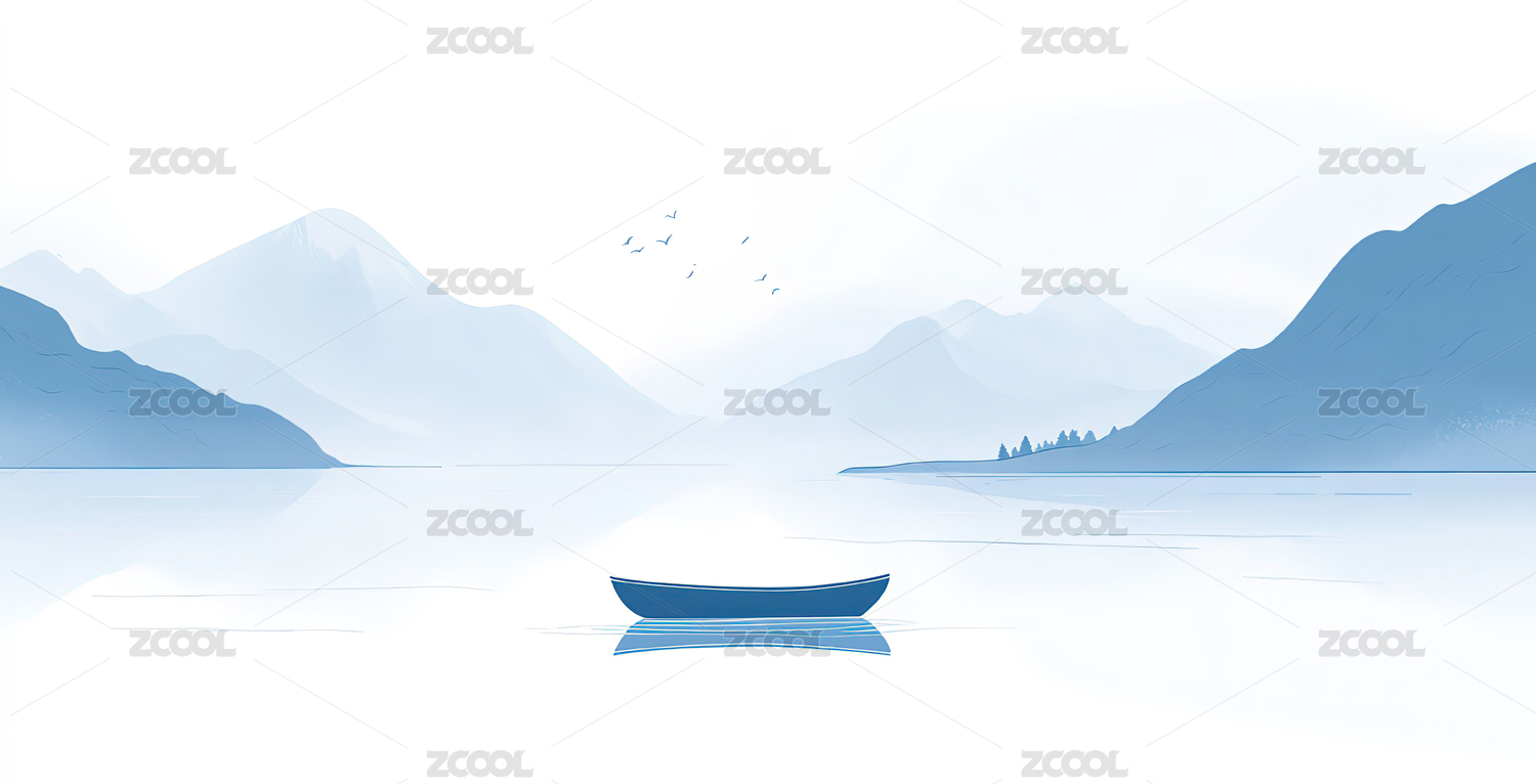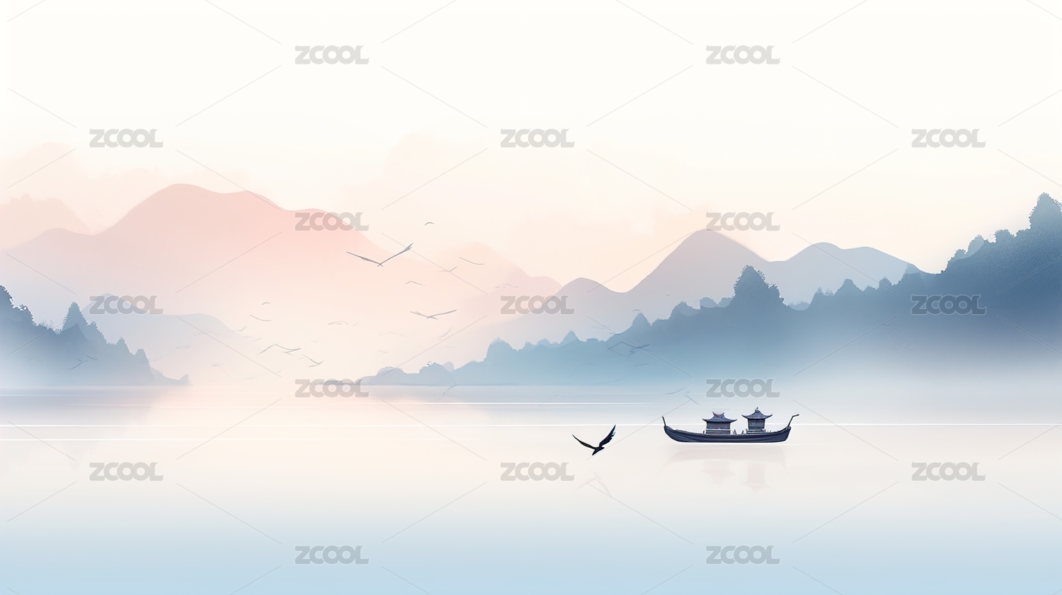 水墨山水意境,扁舟独钓,飞鸟鸣涧