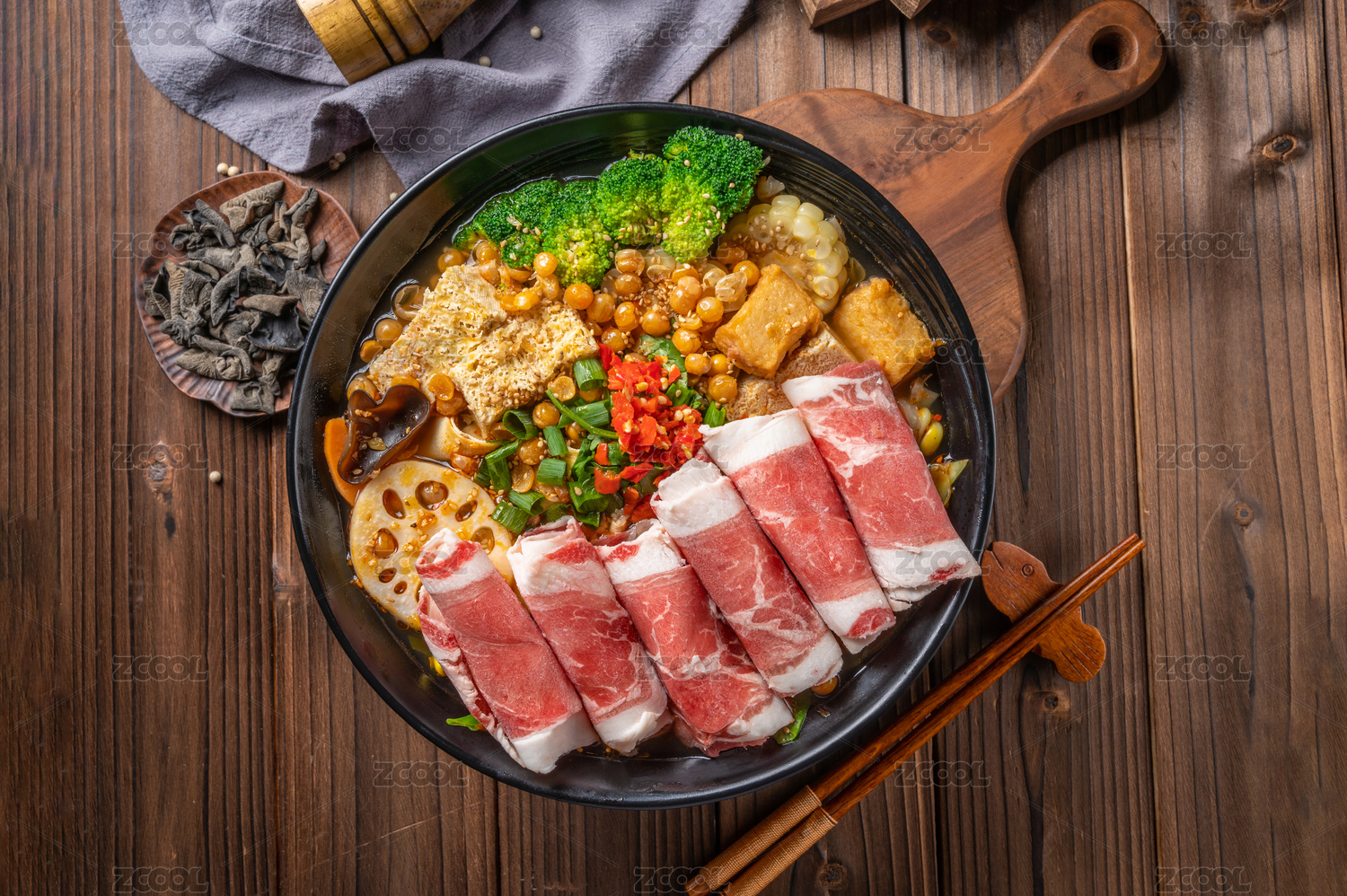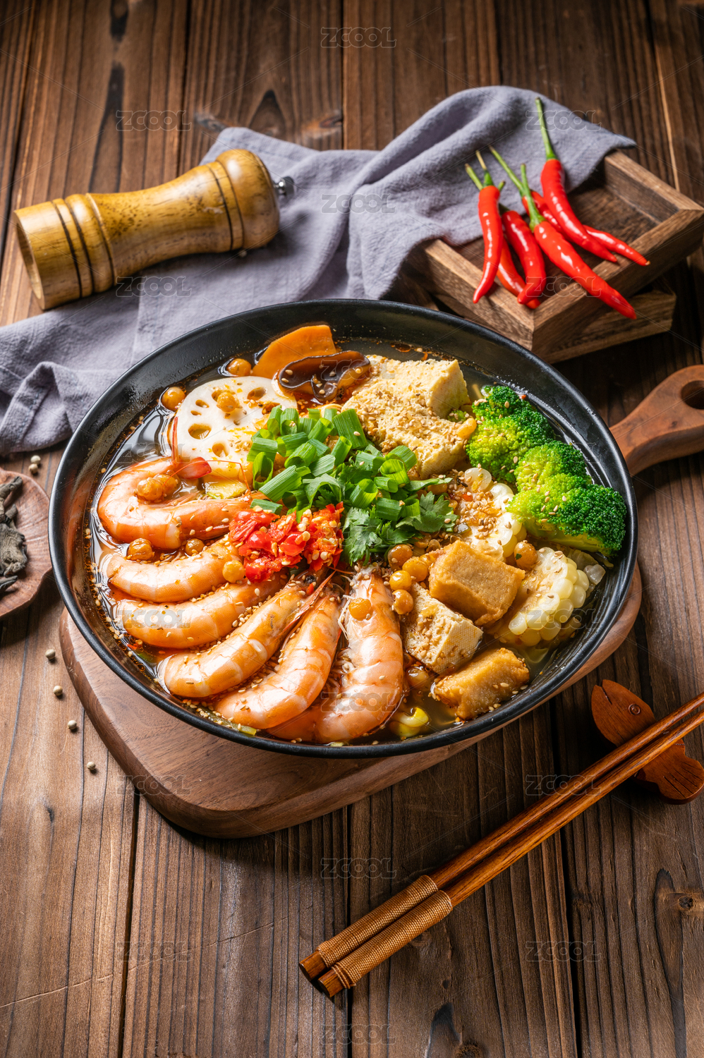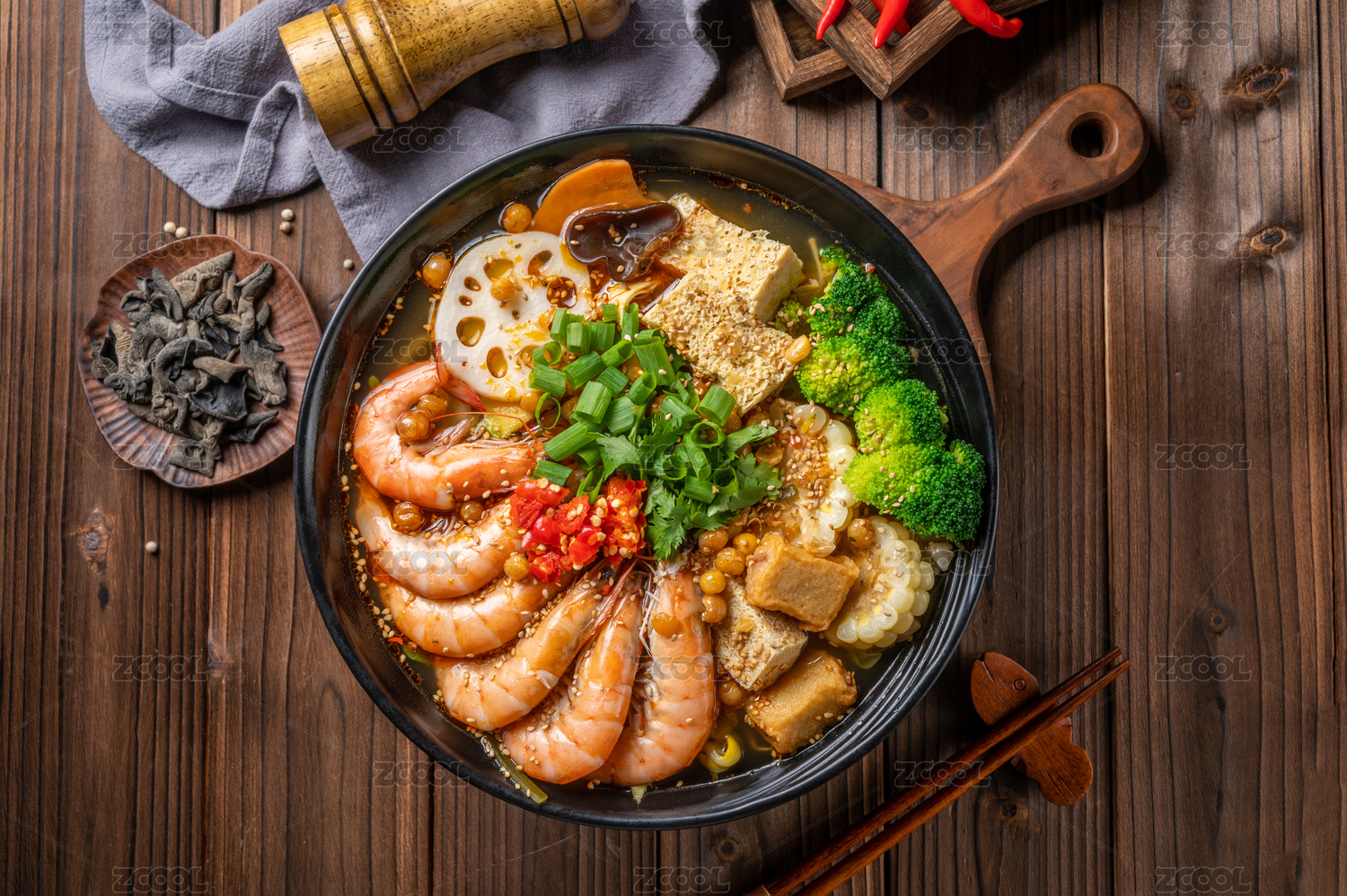 冒菜,大虾,肥牛,毛肚,肉片,丸子,鱿鱼,西蓝花,小米辣,麻辣