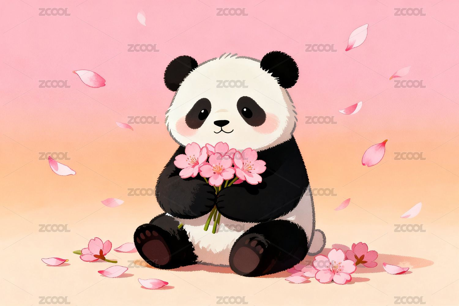 熊猫手捧樱花花瓣环绕