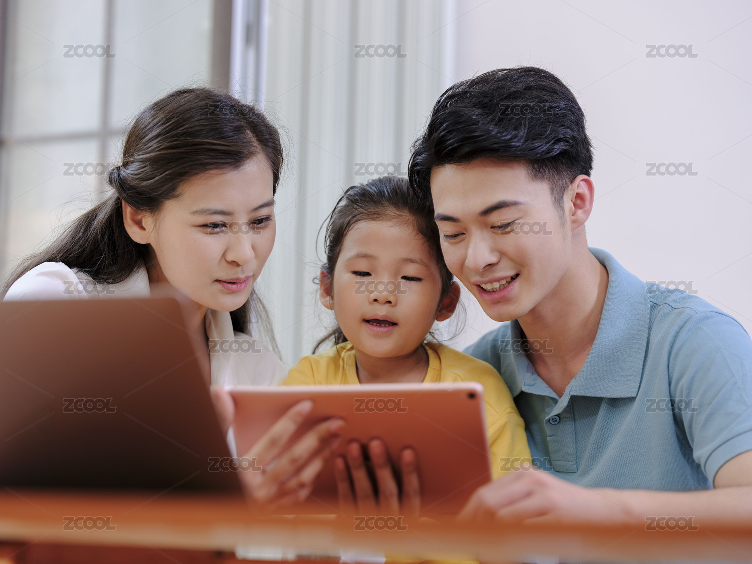 客厅里在陪女儿画画的一家三口