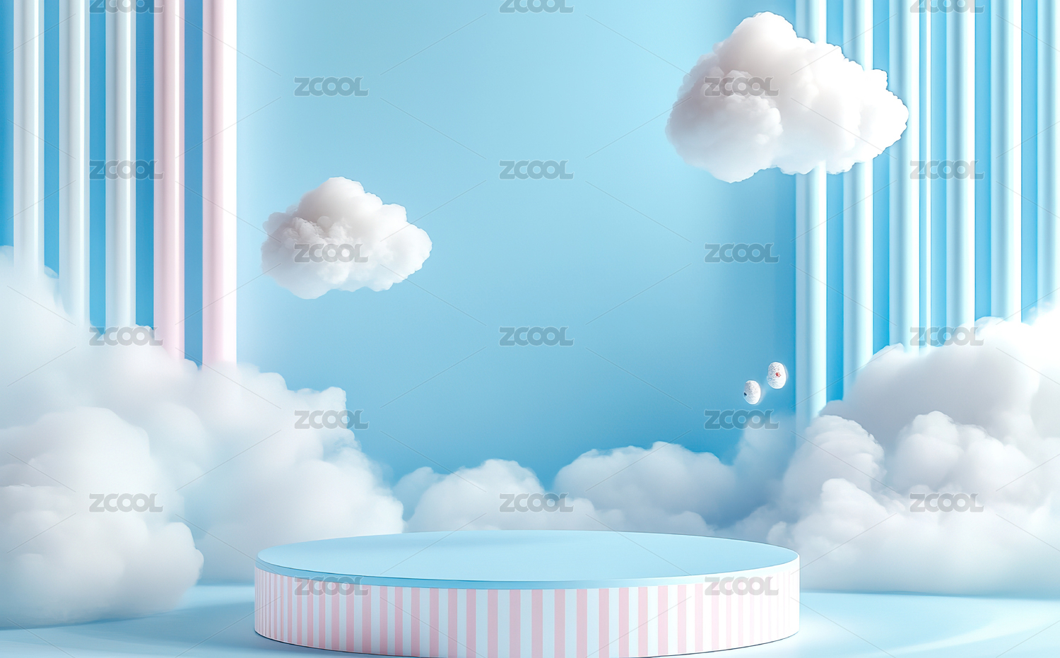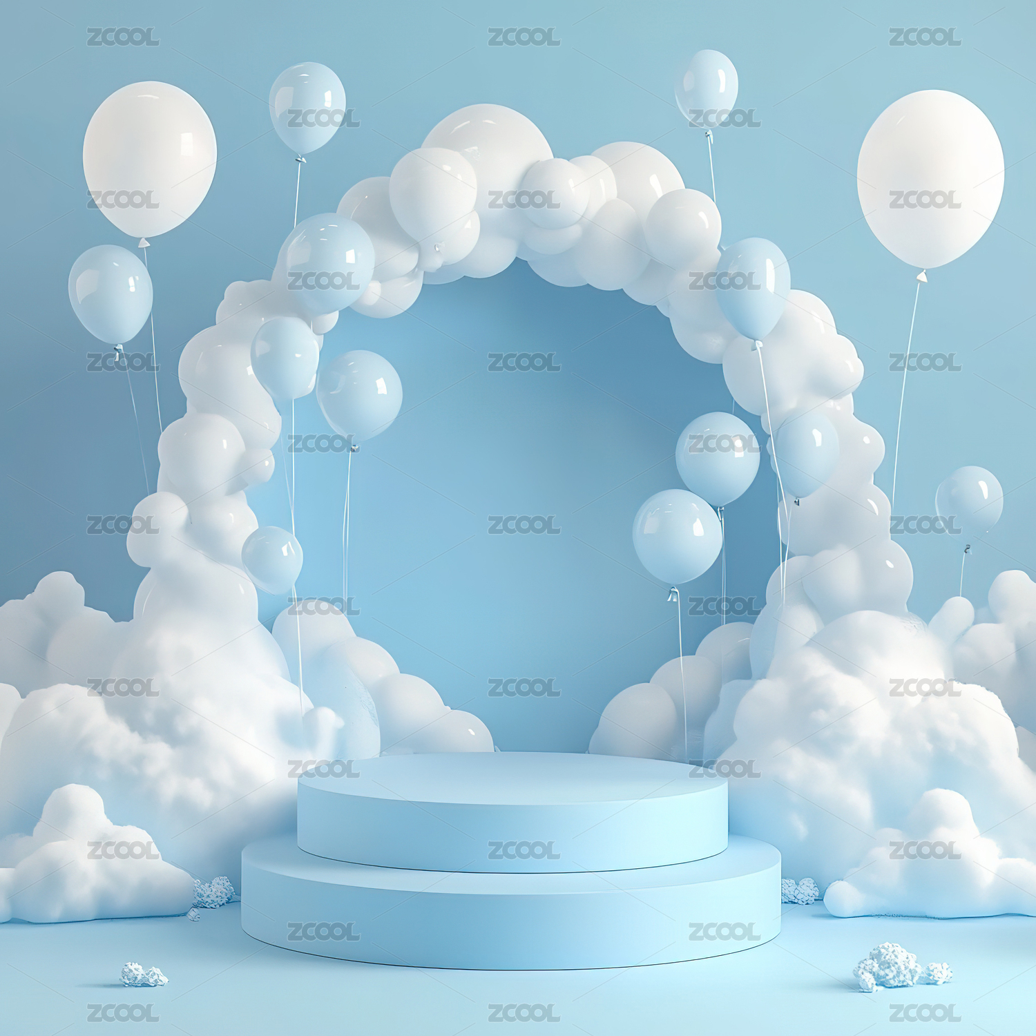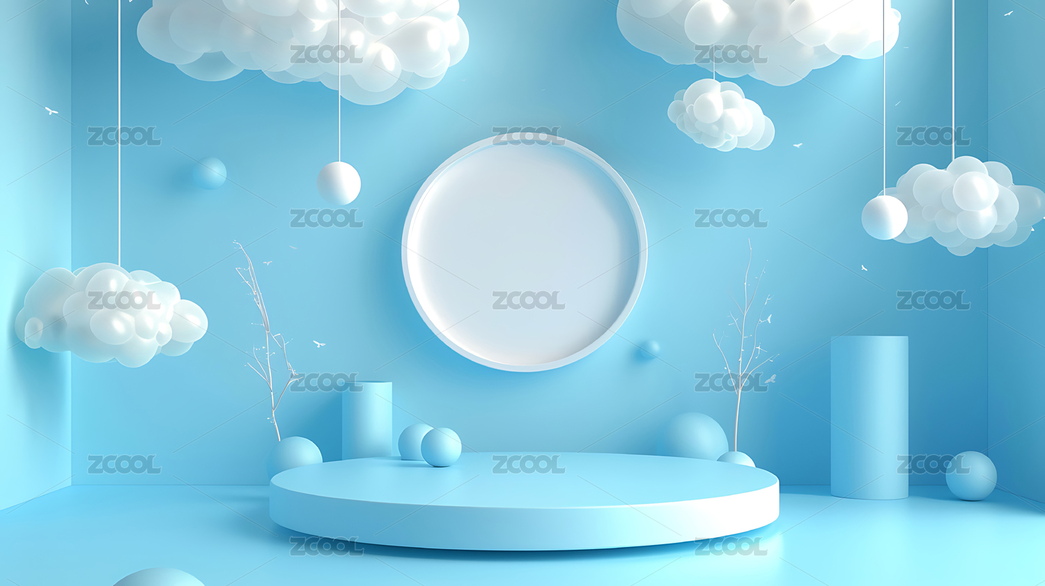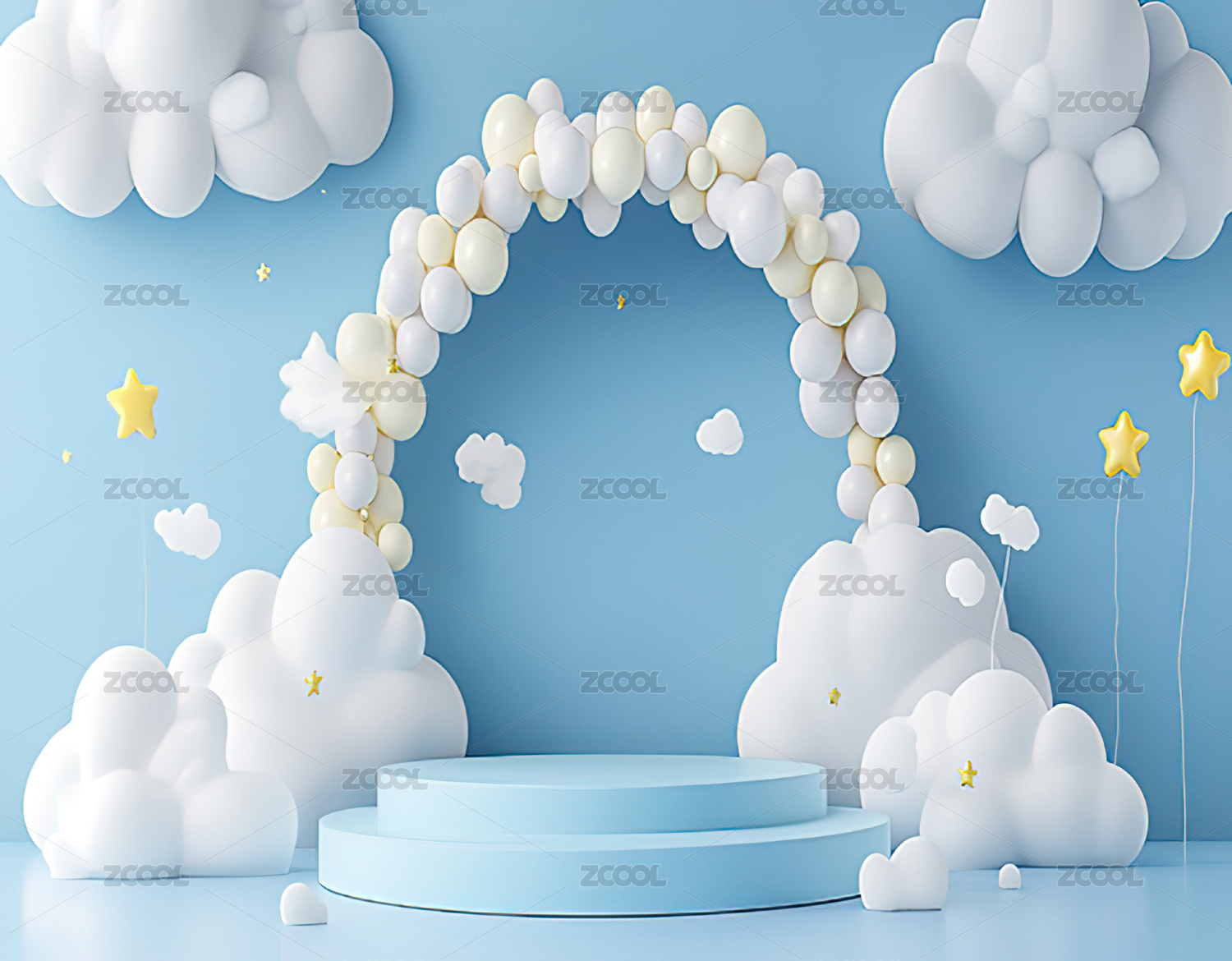 蓝色圆形舞台与白云装饰的梦幻场景