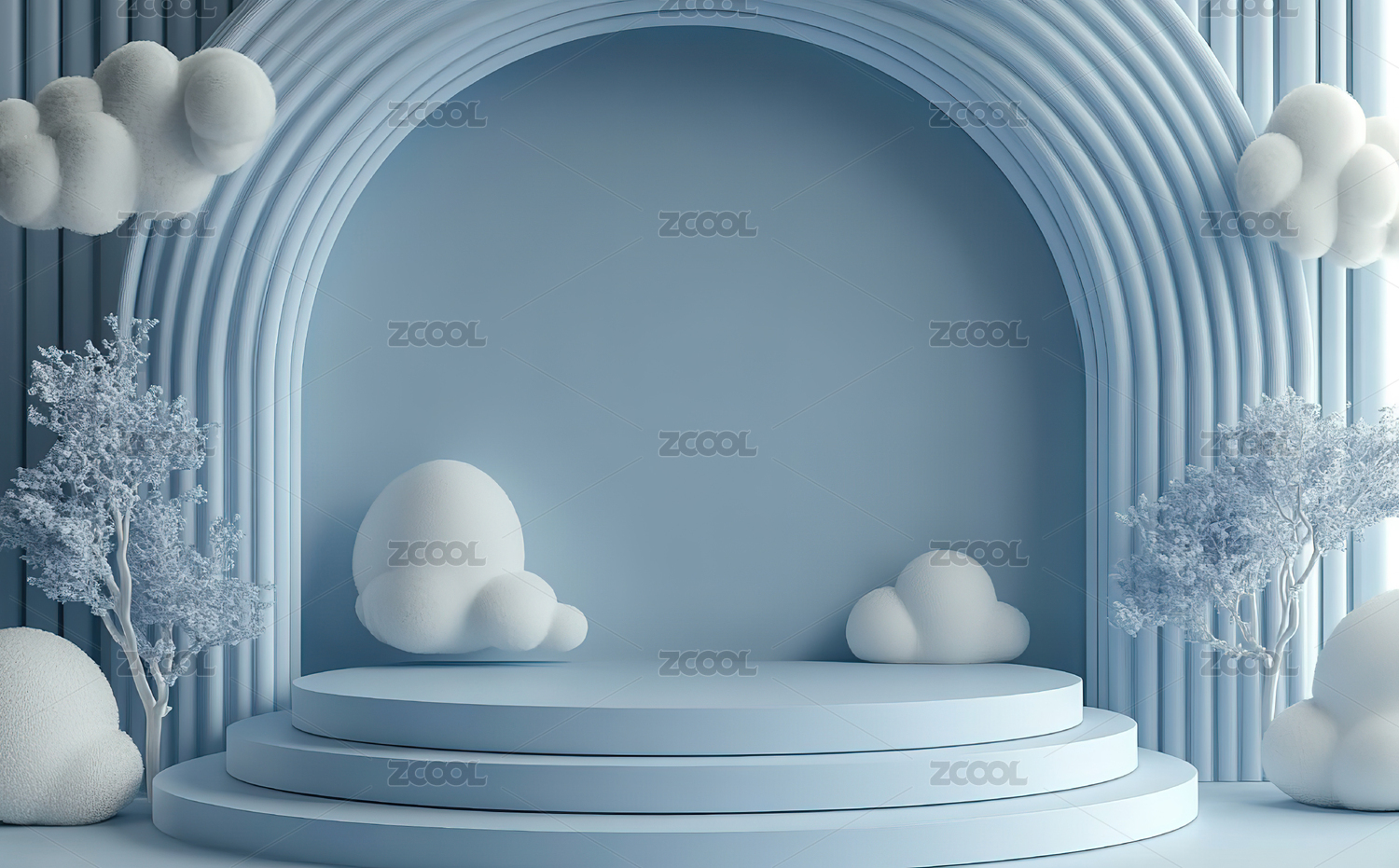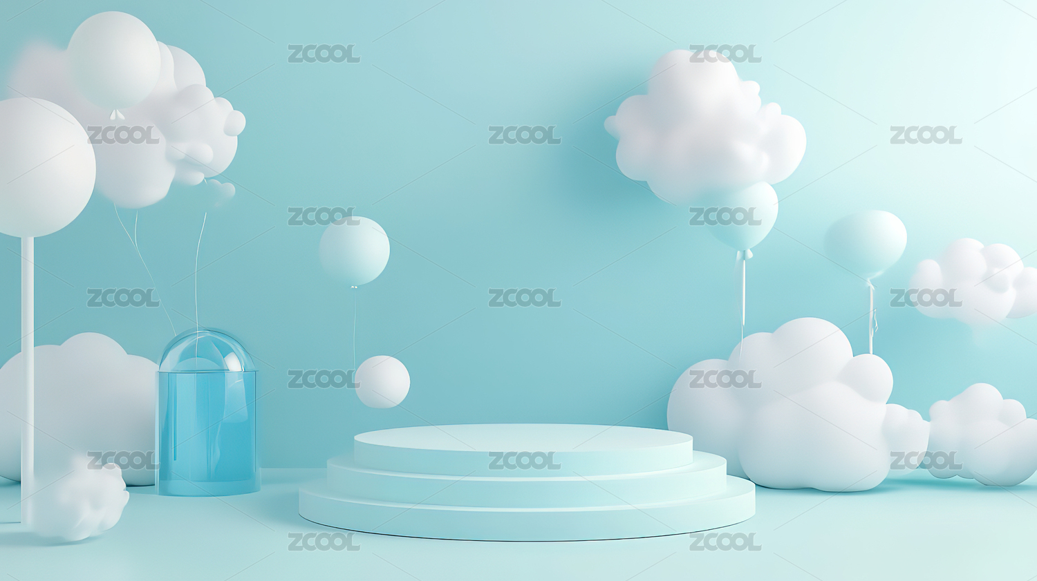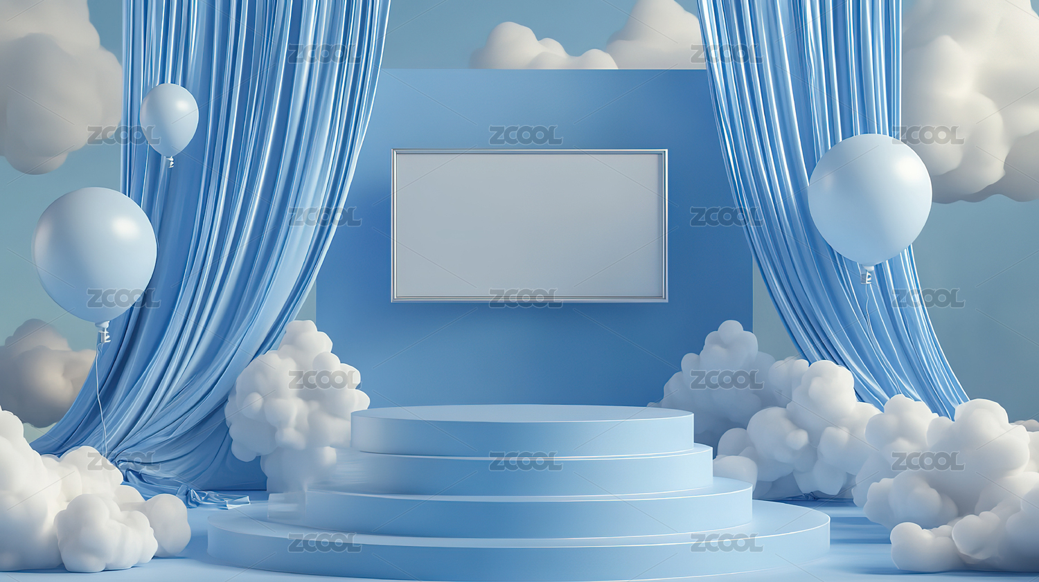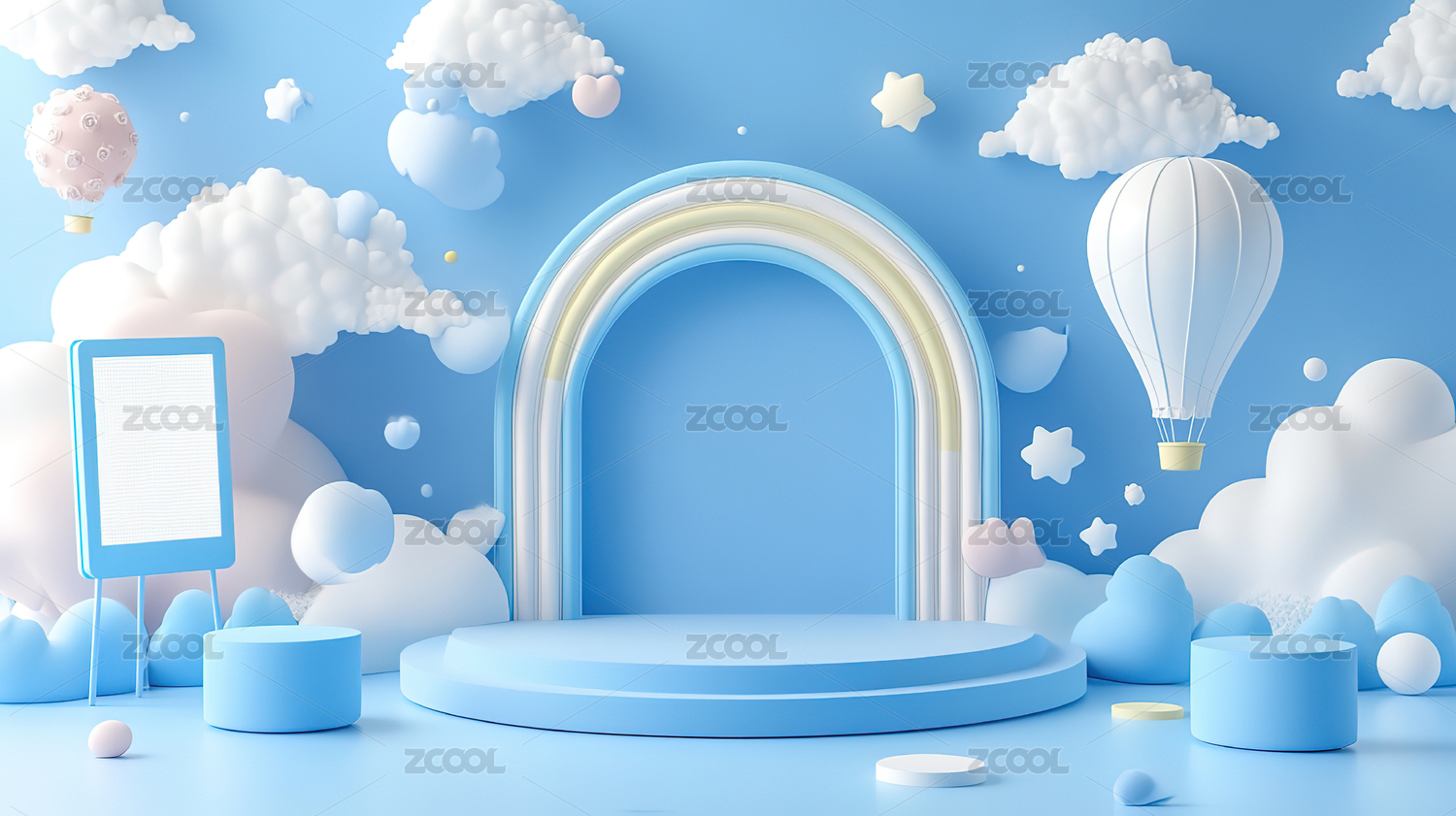 蓝色圆形舞台与白云装饰的梦幻场景