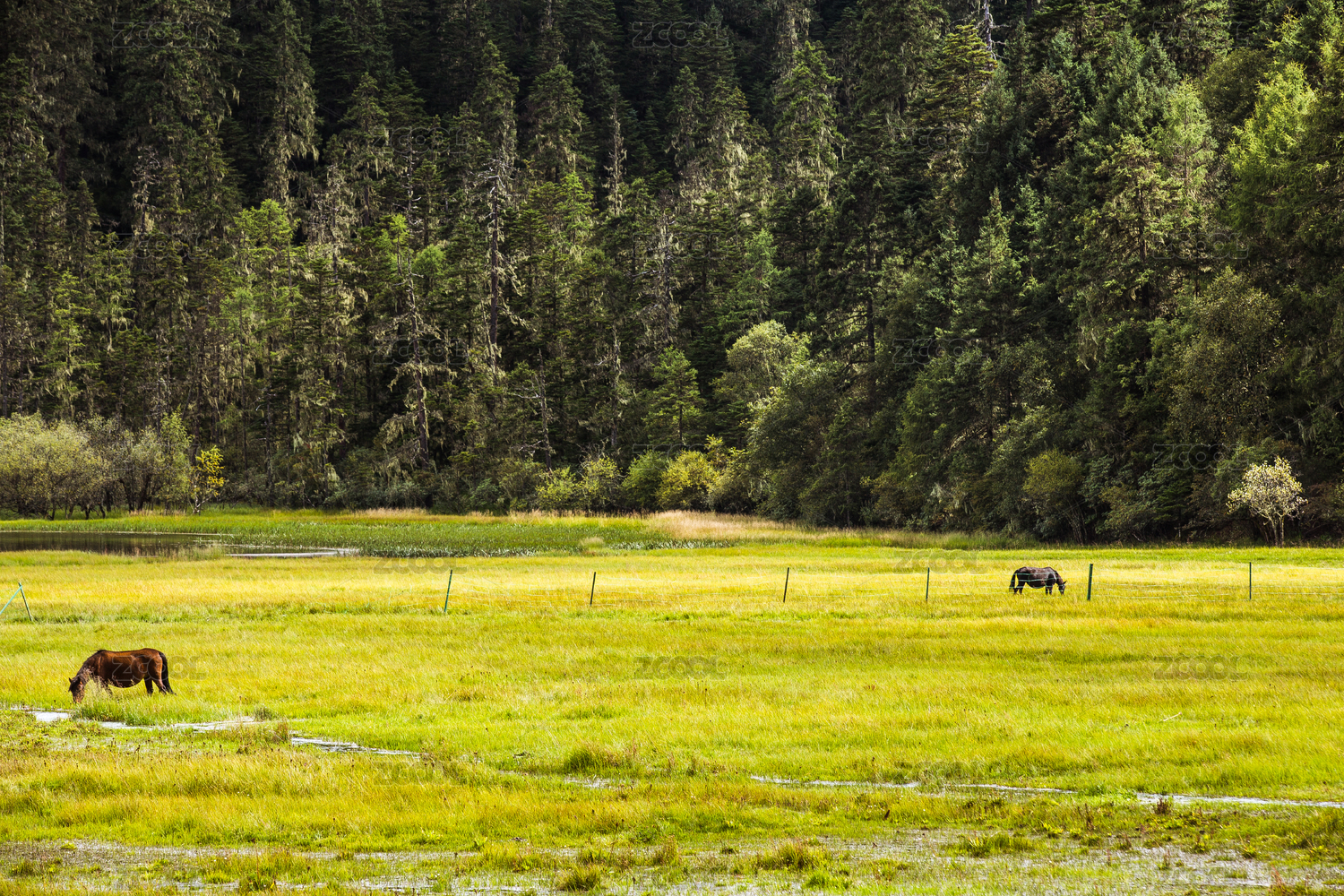 中国四川甘孜月亮湖山林湖畔双马饮水