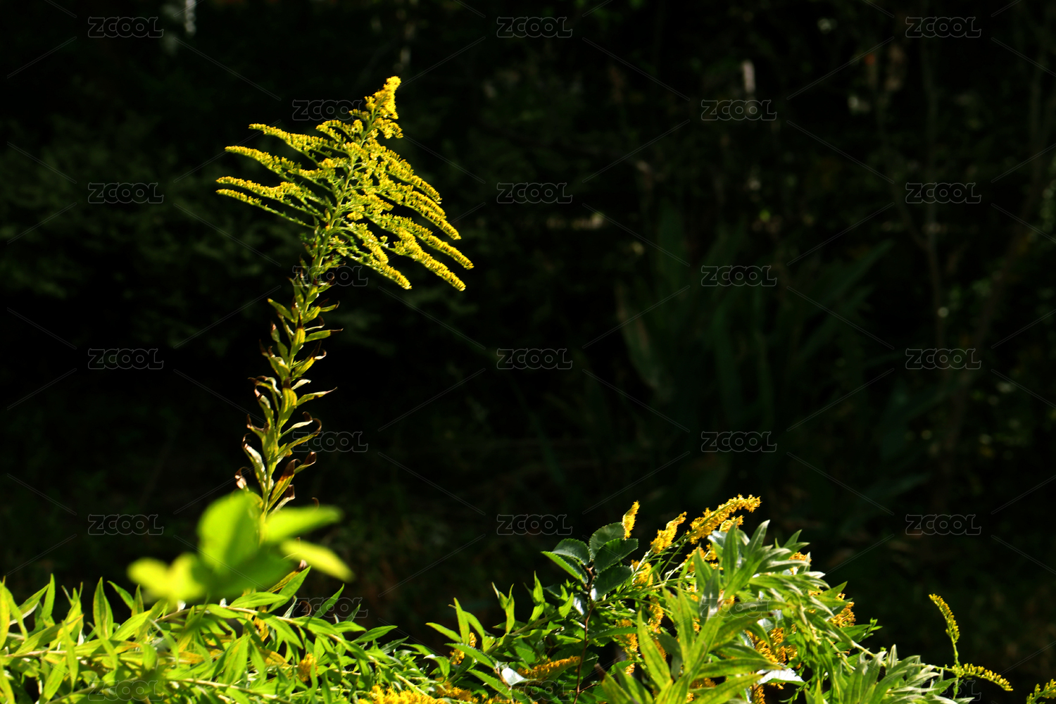一支鲜艳斜向朝上的黄莺伫立在暗绿背景前