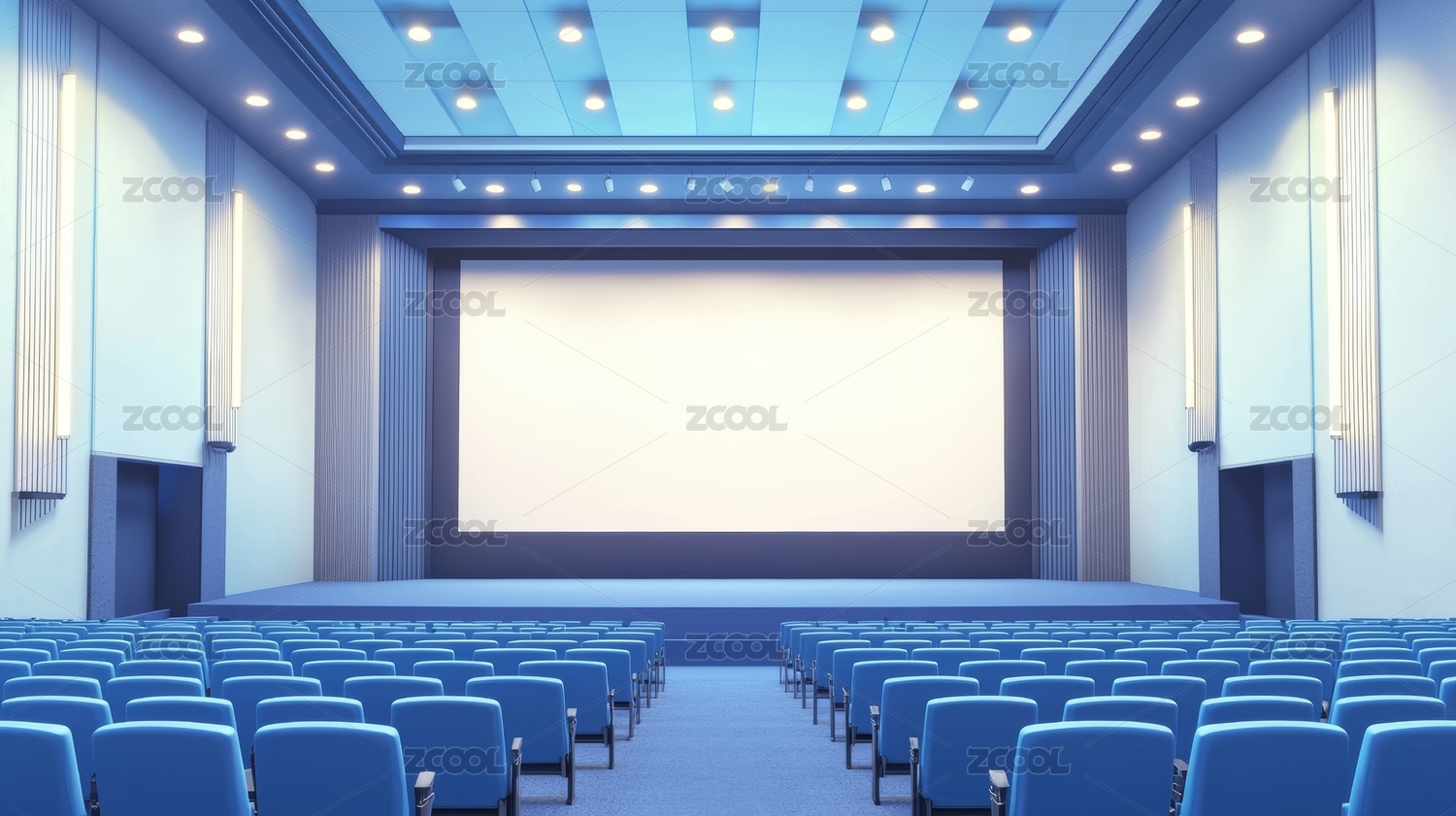 蓝色灯光下的现代电影院宽敞座位区