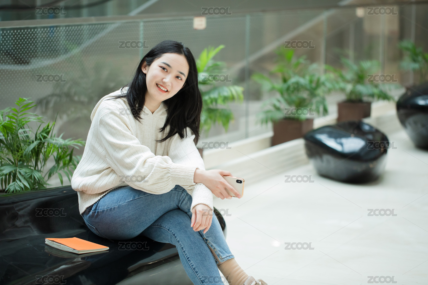 青年女学生坐在图书馆休息放松
