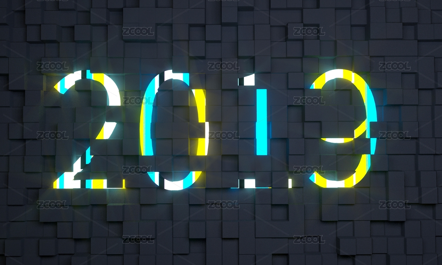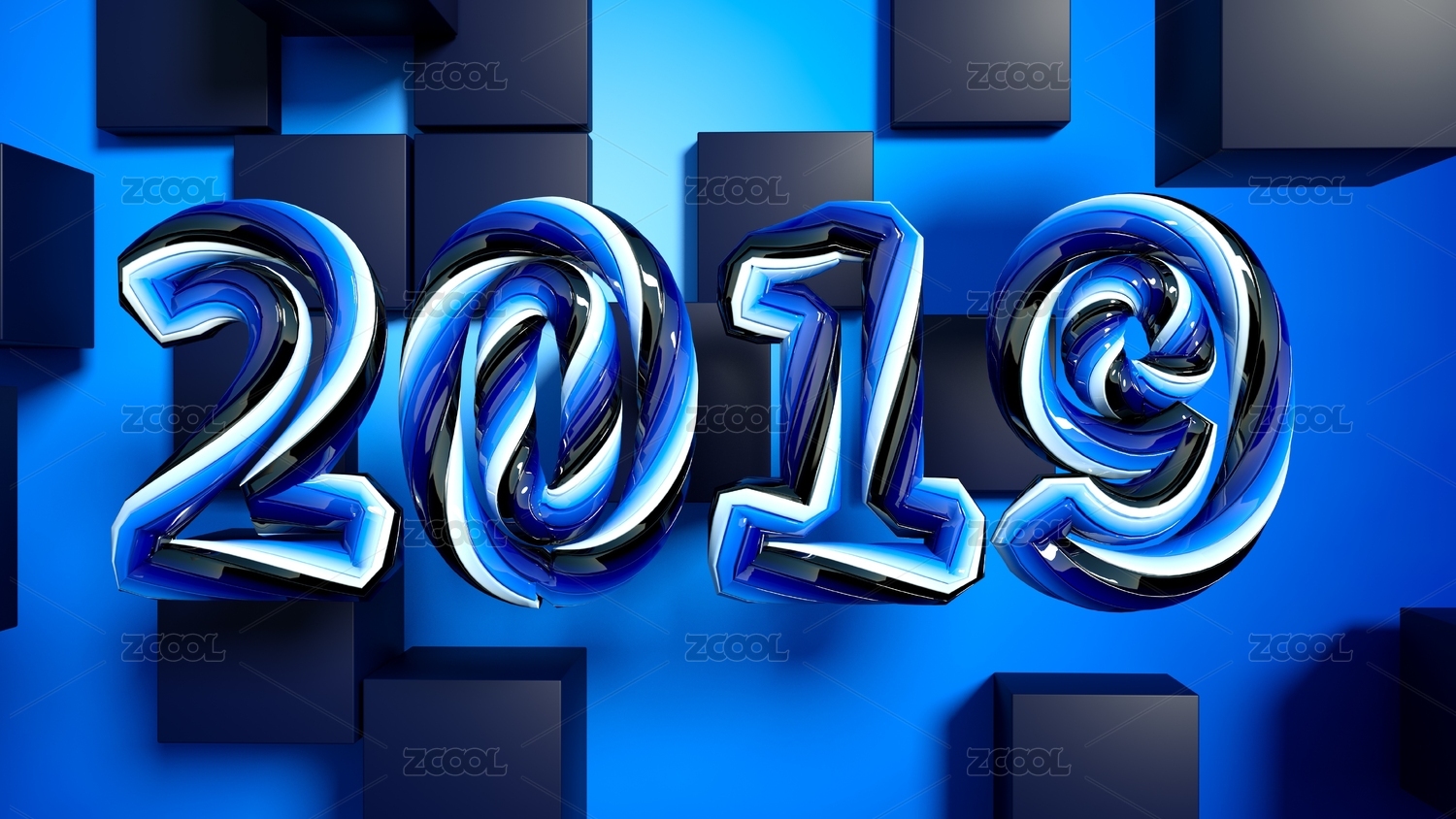 由黑色方块和3D金属字体组成的2019年科幻背景
