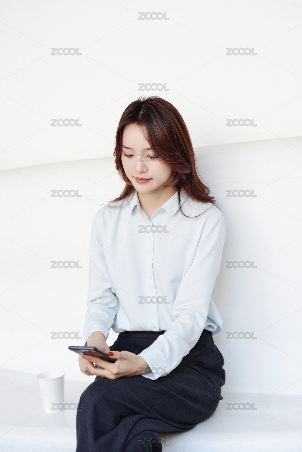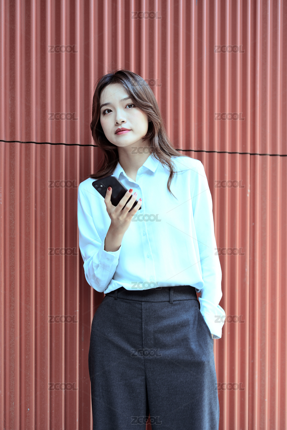红色背景墙前一商务女生在使用手机