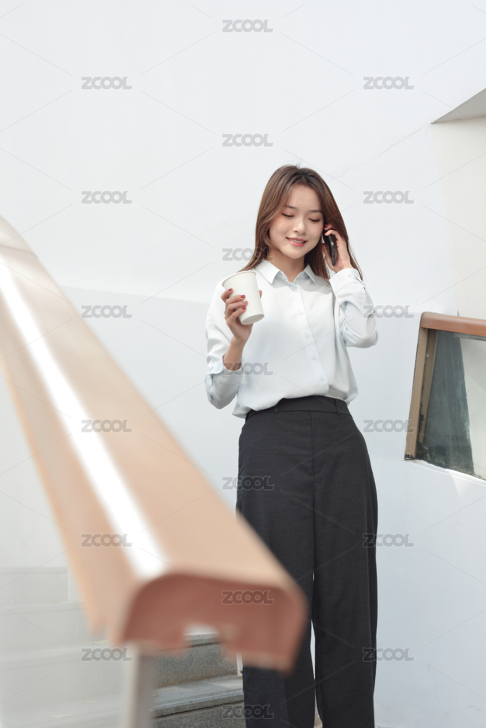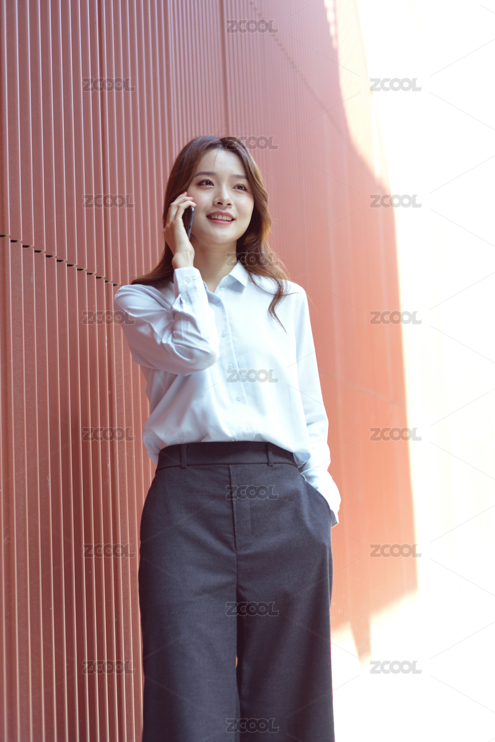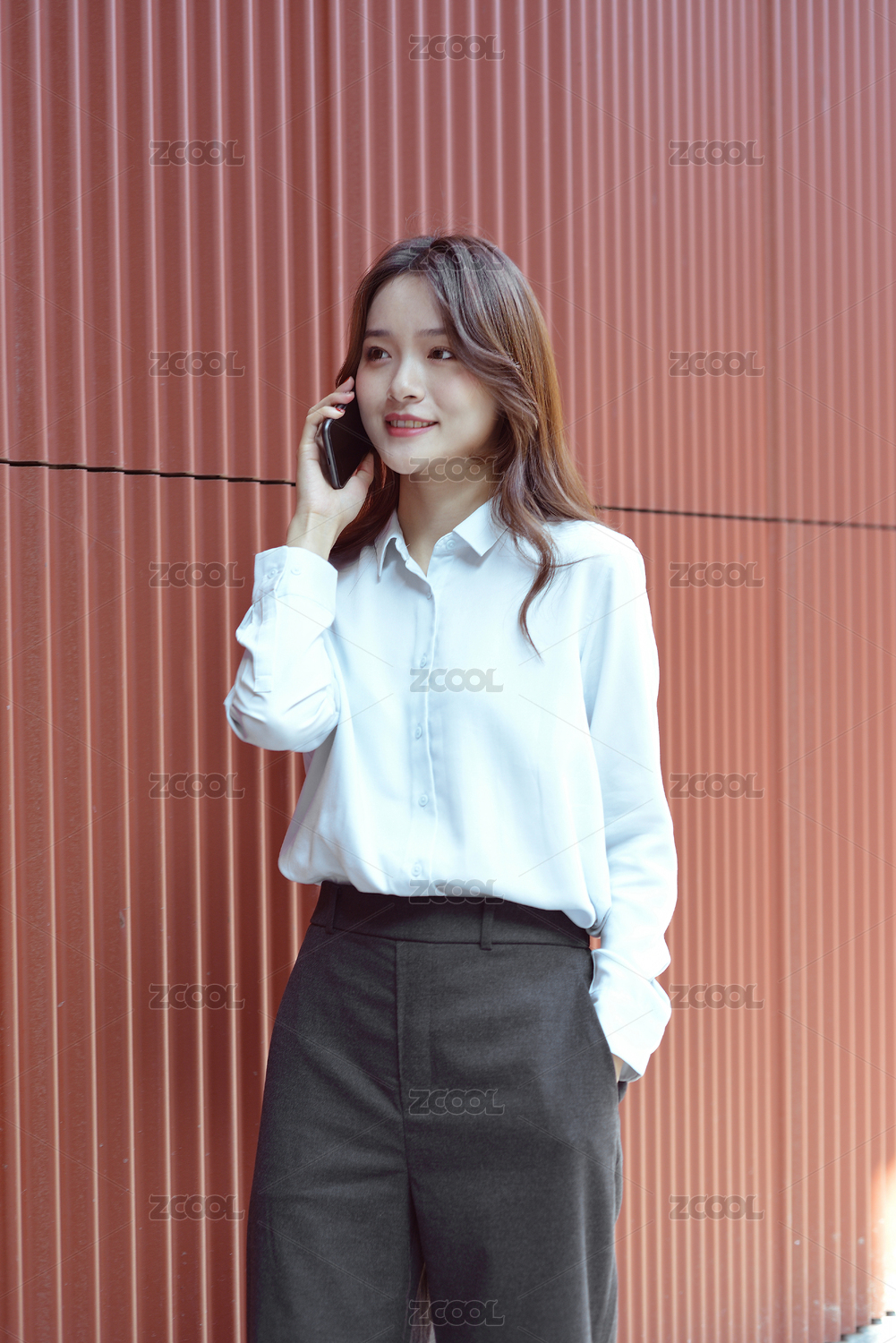 棕红色竖纹墙前一个亚裔职业年轻女性正在用手机打电话