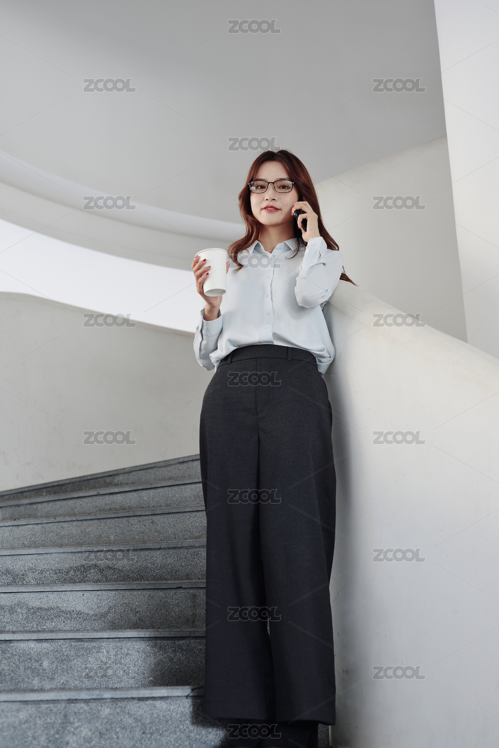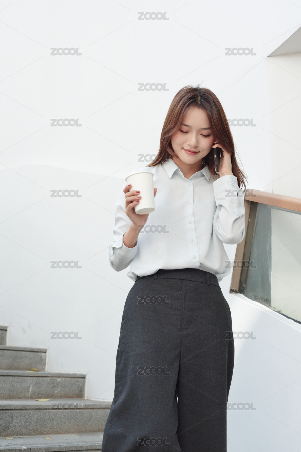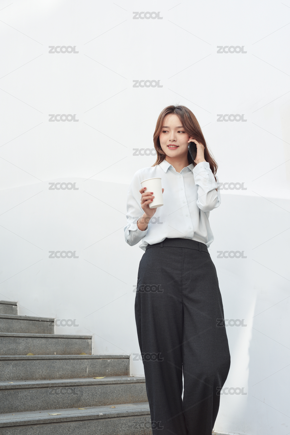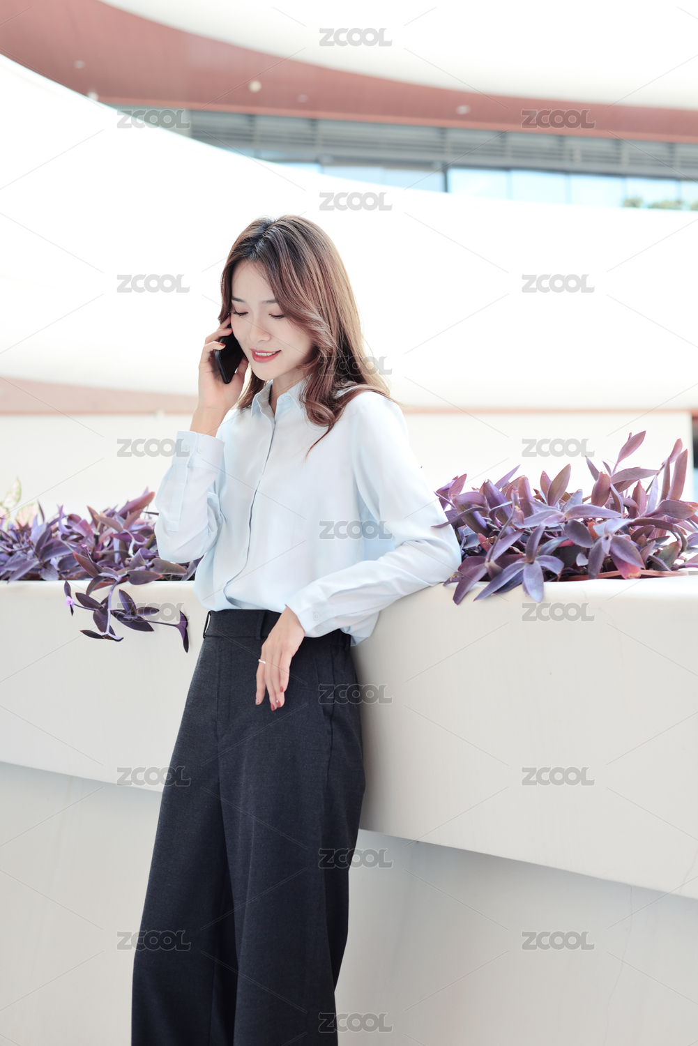 棕红色竖纹墙前一个亚裔职业年轻女性正在用手机打电话
