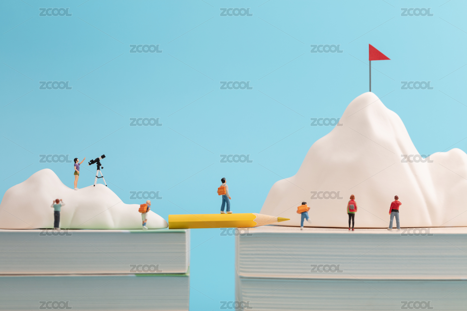 微缩创意在书本山峰上攀岩的挑战者