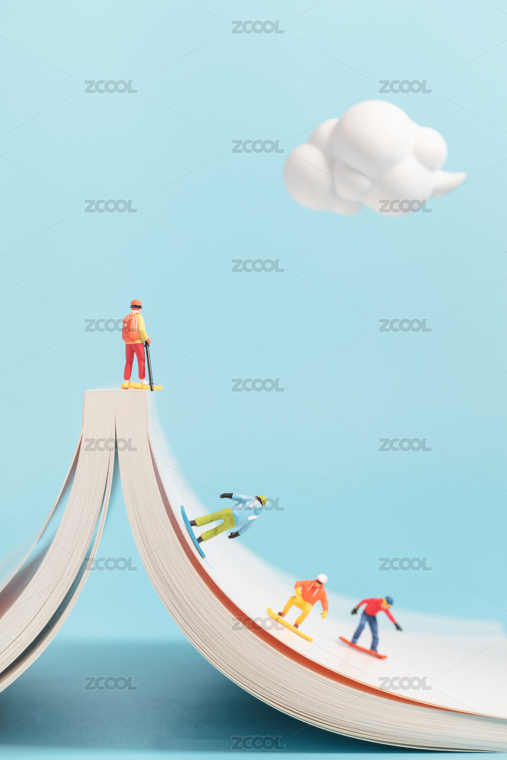微缩创意摊开的书与滑雪的人
