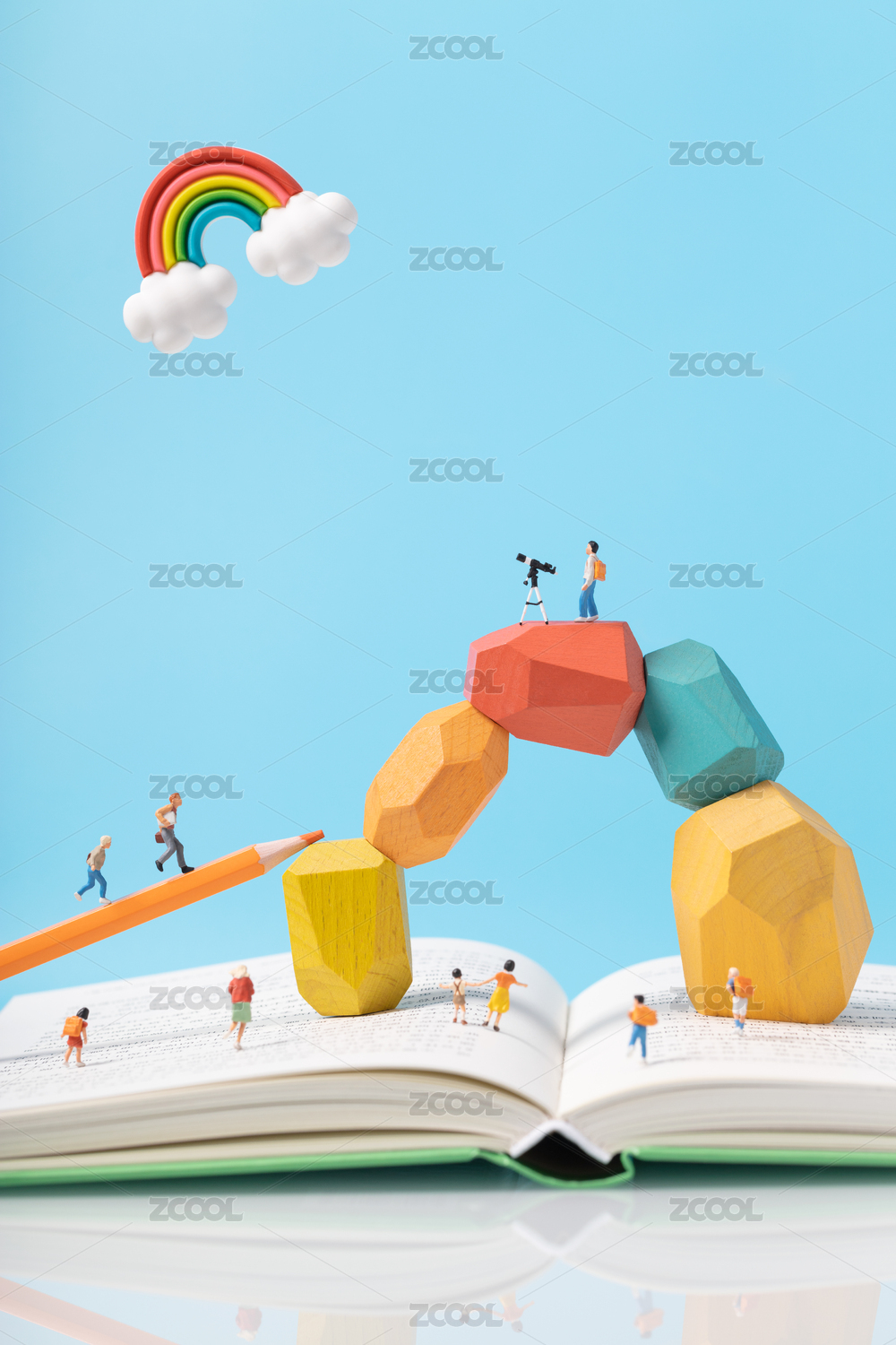 微缩创意彩虹色积木上眺望远方的学生