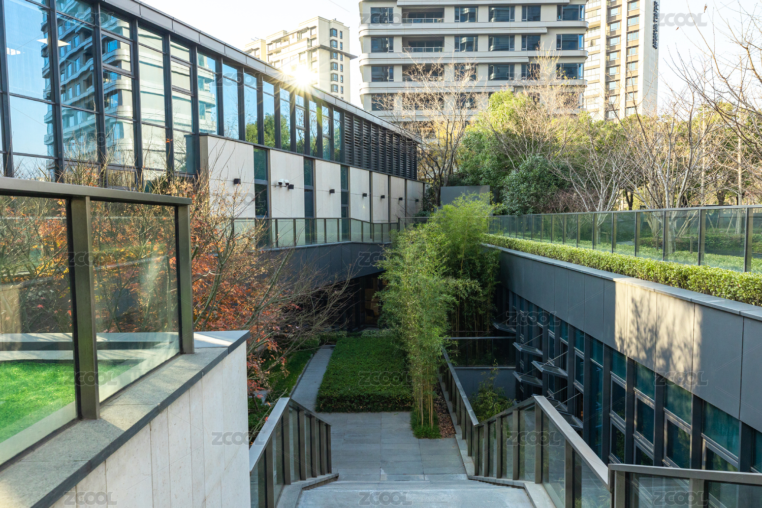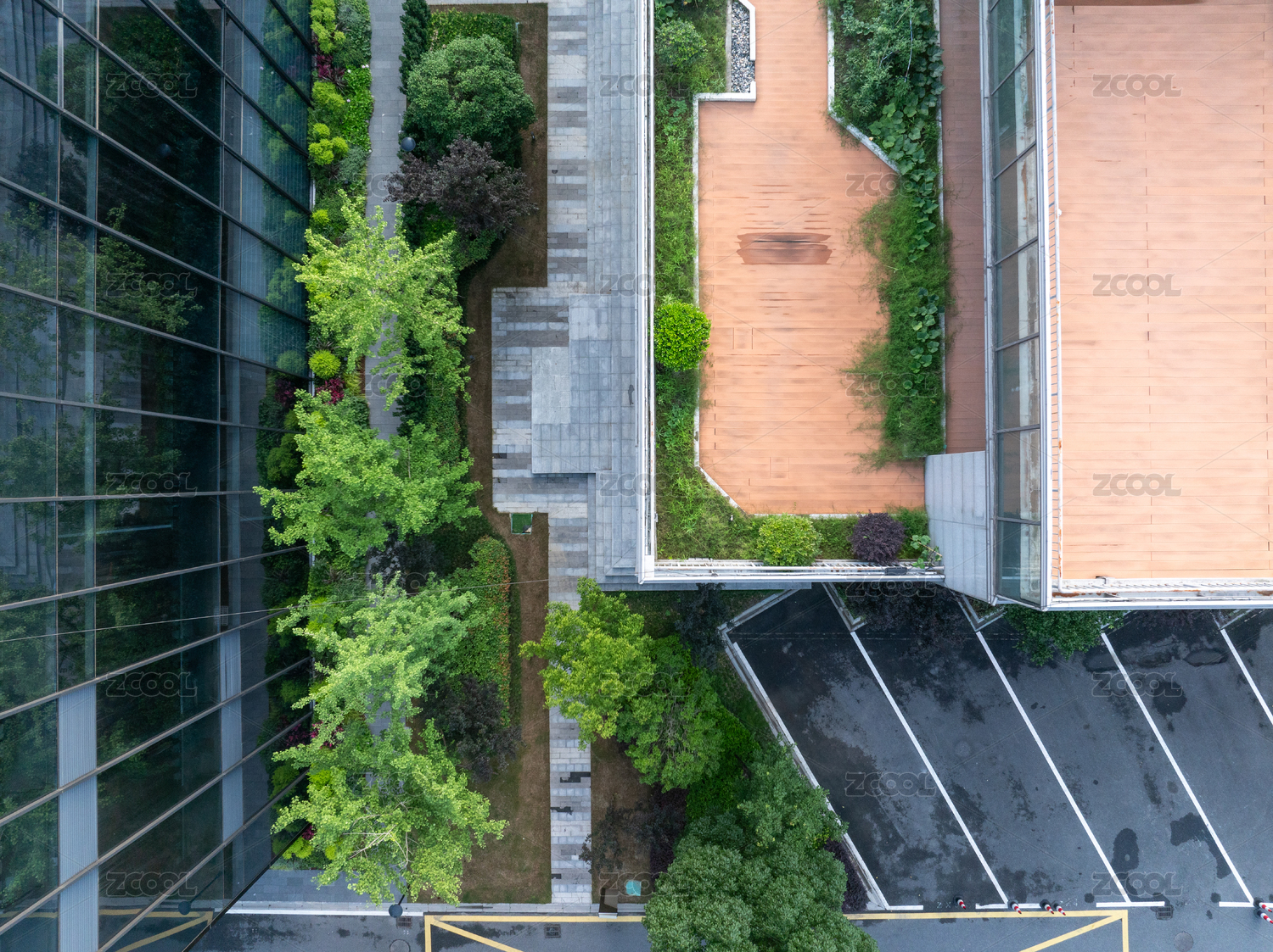 俯瞰办公大楼屋顶的公园露台