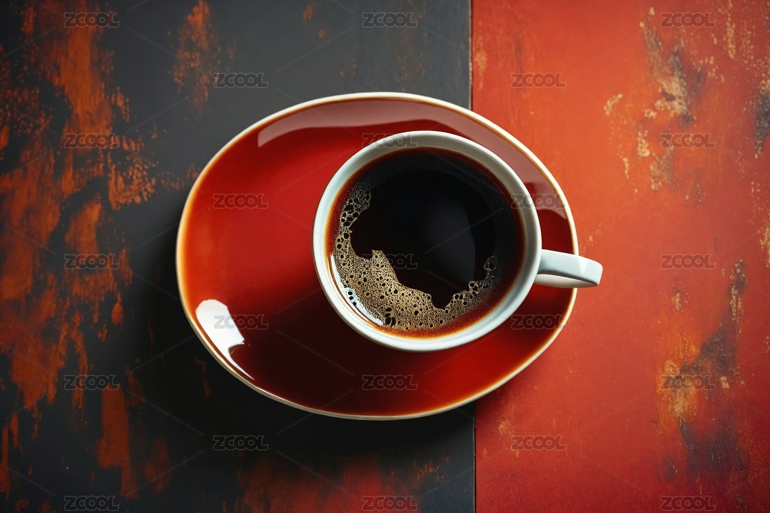 一杯咖啡和咖啡豆摆放在桌面上特写